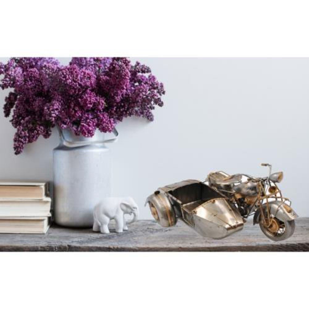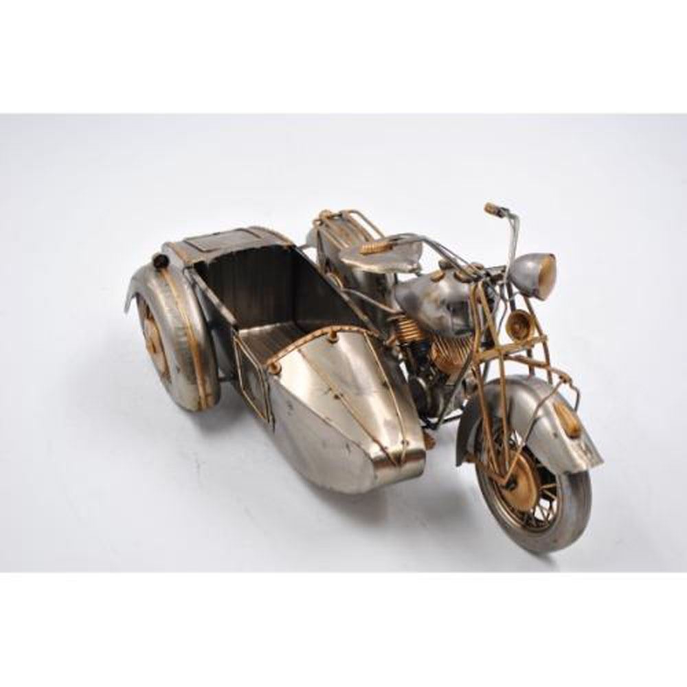 Iron Harley Davidson Bike Sculpture. Featuring a rustic iron frame, this charming vintage Motorcycle includes a sidecar. The silver and gold metal seat and handlebars are finished in natural colors. Overall measurement (Approx. HXW) : 6X10X6 Inches. Weight: 7 LBS.