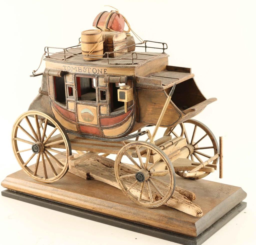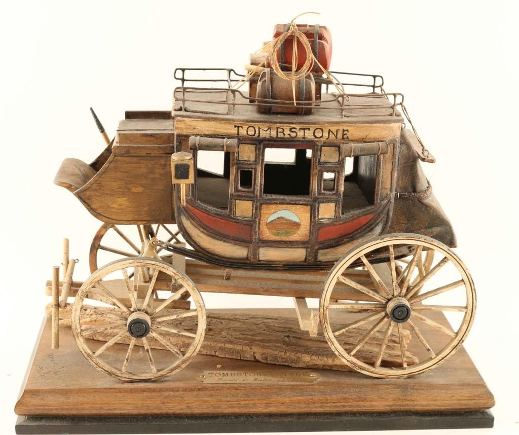 with plaque reads "Tombstone to Bisbee Arizona". 9.5"X13", all wood with hand painted and stained exterior back storage is leather on wood base.