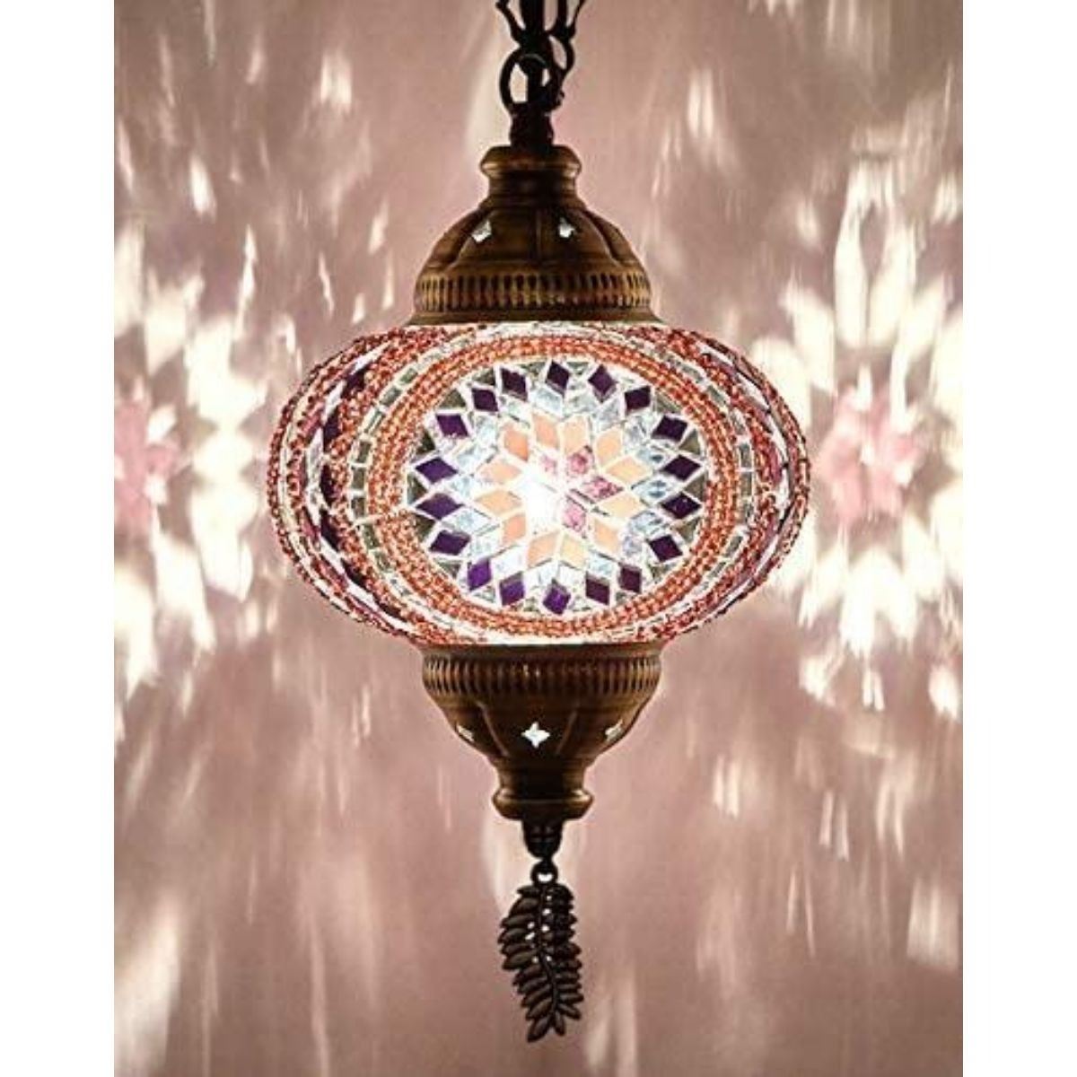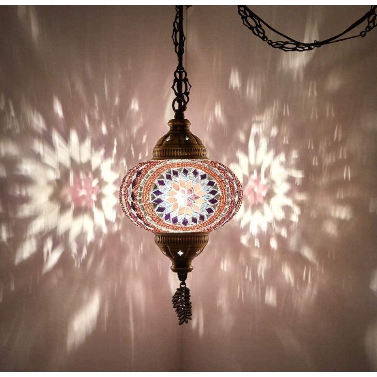 Handmade Moroccan mosaic art glass hanging swag, plug-in pendant light with lilac purple tones. Hangs at about 24" with 15" of extra cord, chain & plug. 6 1/2" globe diameter.Â