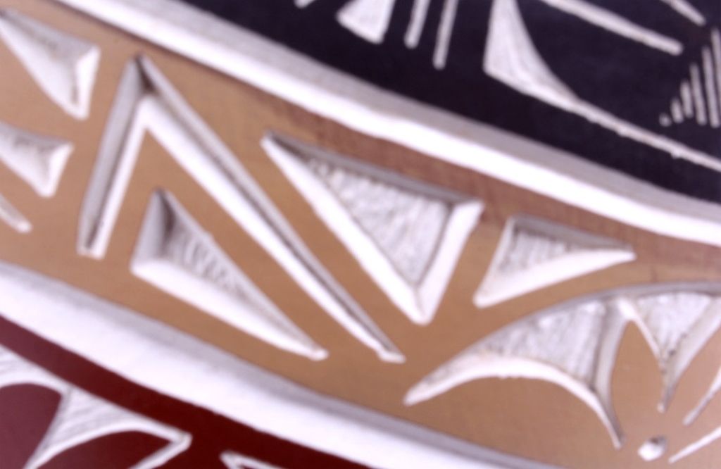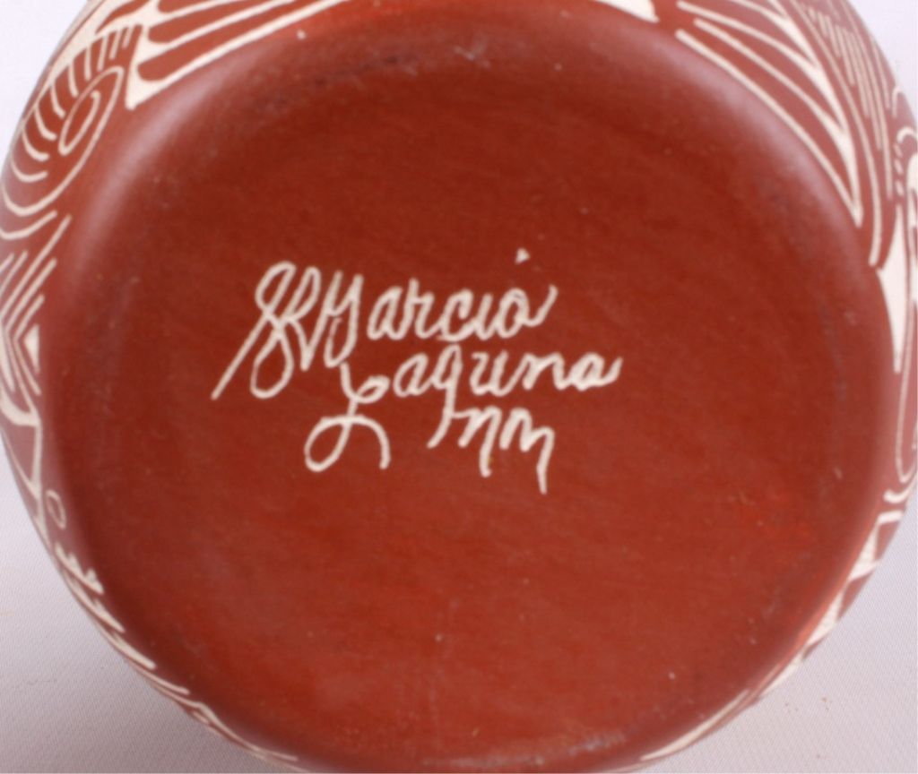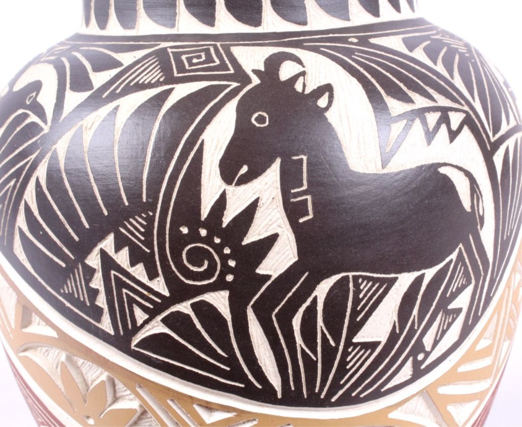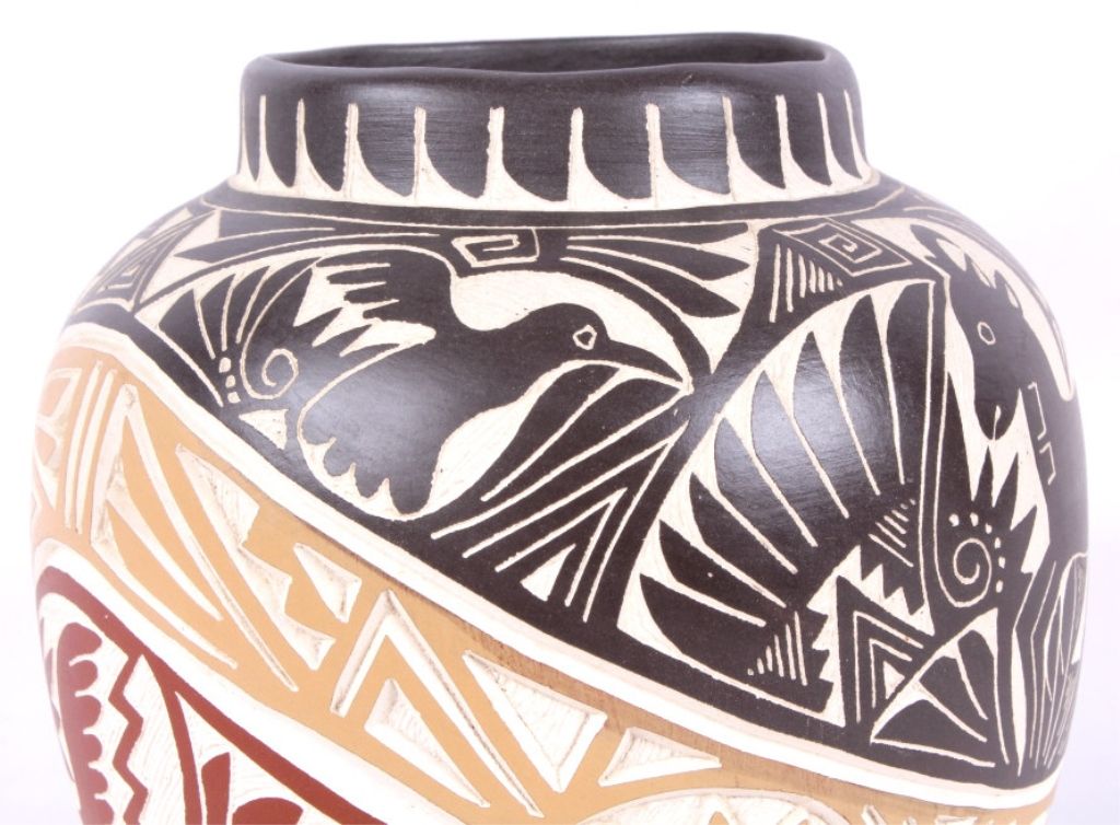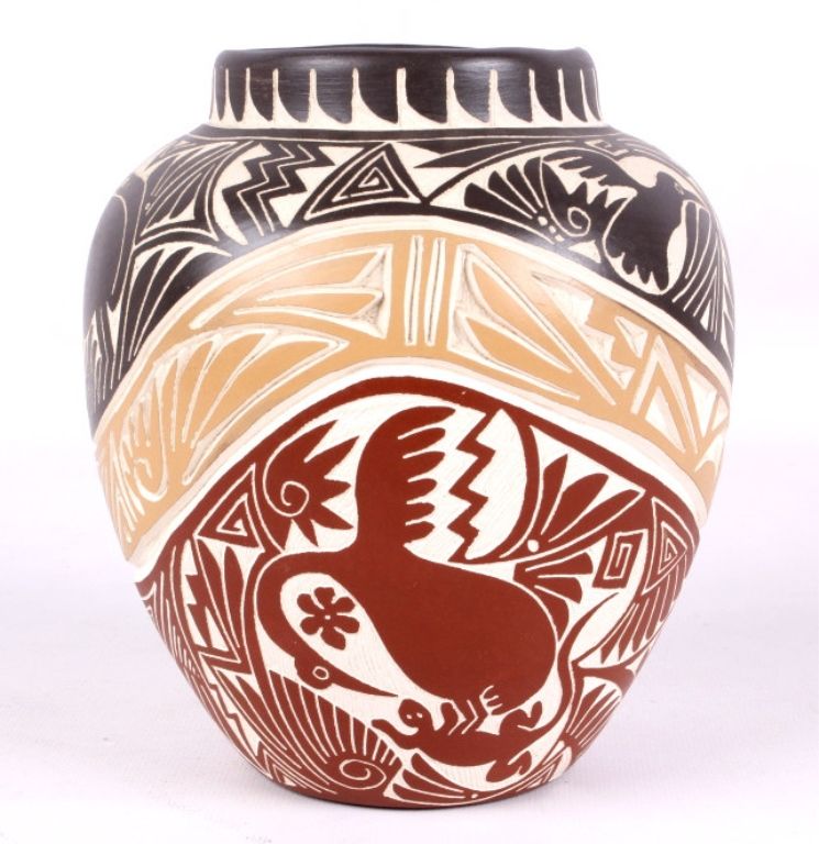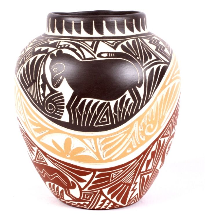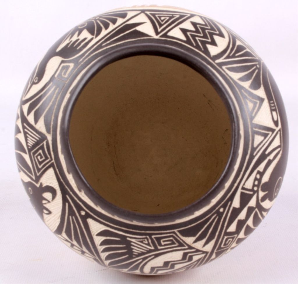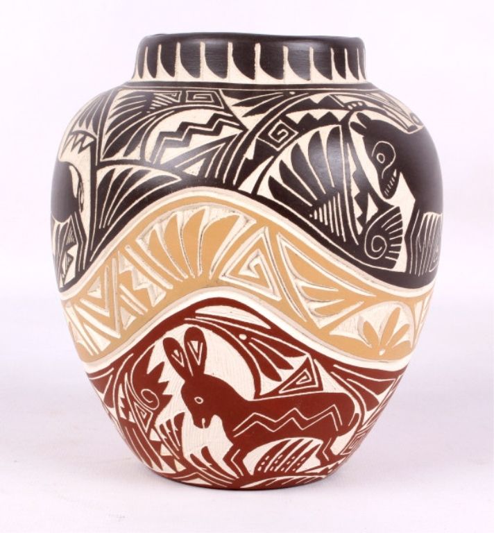 This lot features a unique piece of Navajo pottery. It has hand etched depictions of animals and decorative Navajo designs. It has been signed on the bottom by the artist. It measures 6" x 7".