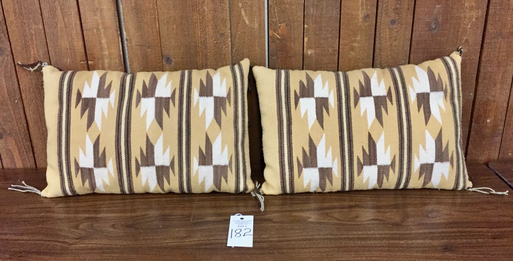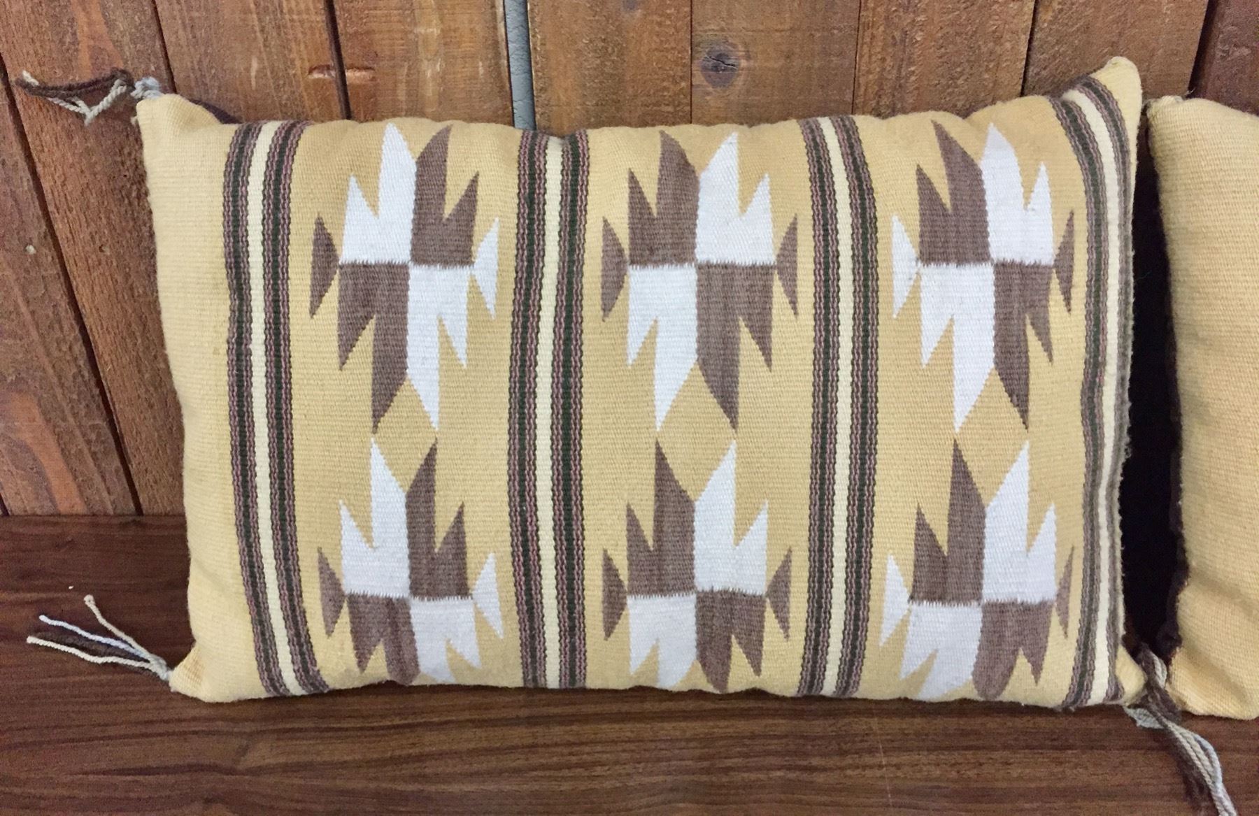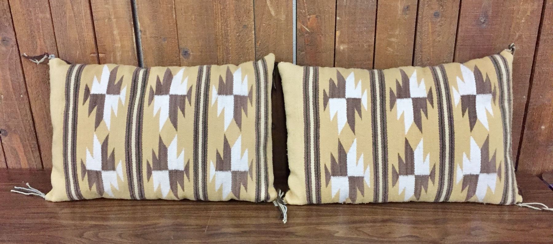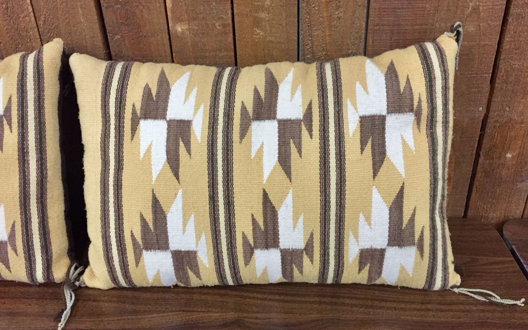 Description: Offered for sale in this lot we have two handmade Navajo textile pillows featuring geometric patterns in white, golden yellow and tan base colors. Maker: Unknown Navajo weaver. Approx. Age: Vintage. Size: 20 inches wide x 13 inches tall. Condition: Good for their ages, normal wear expected. Please look closely at the pictures - they are an important part of our description. Shipping: There will be a $5 handling, packaging fee for shipping this lot. The actual cost of postage will be added on top of that.