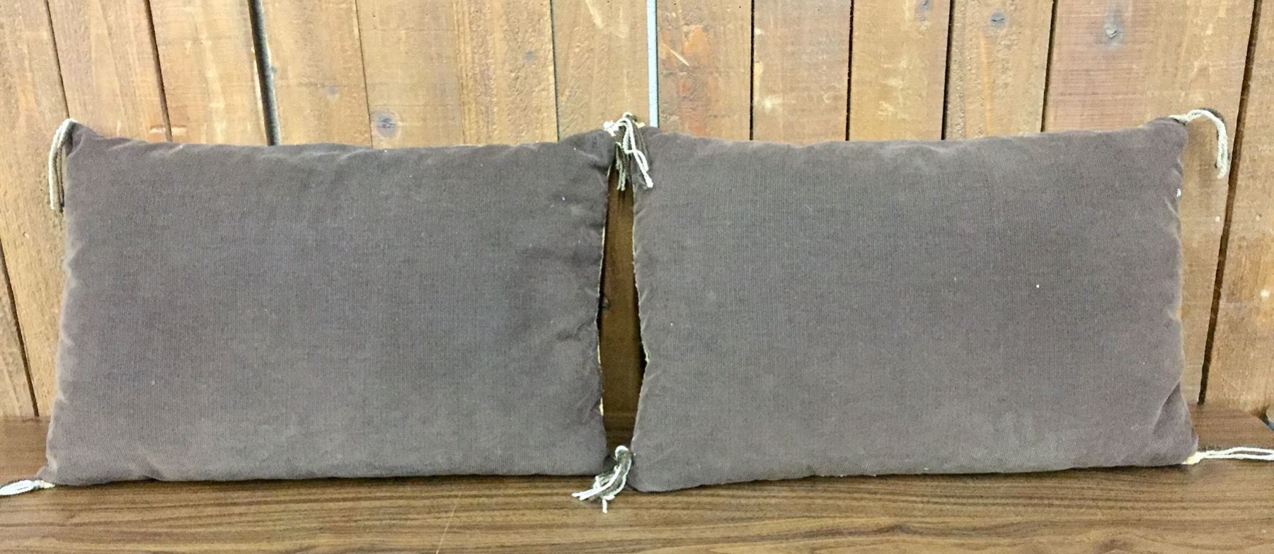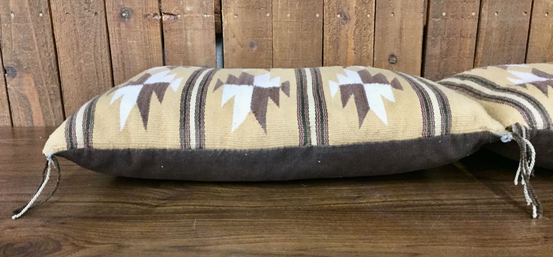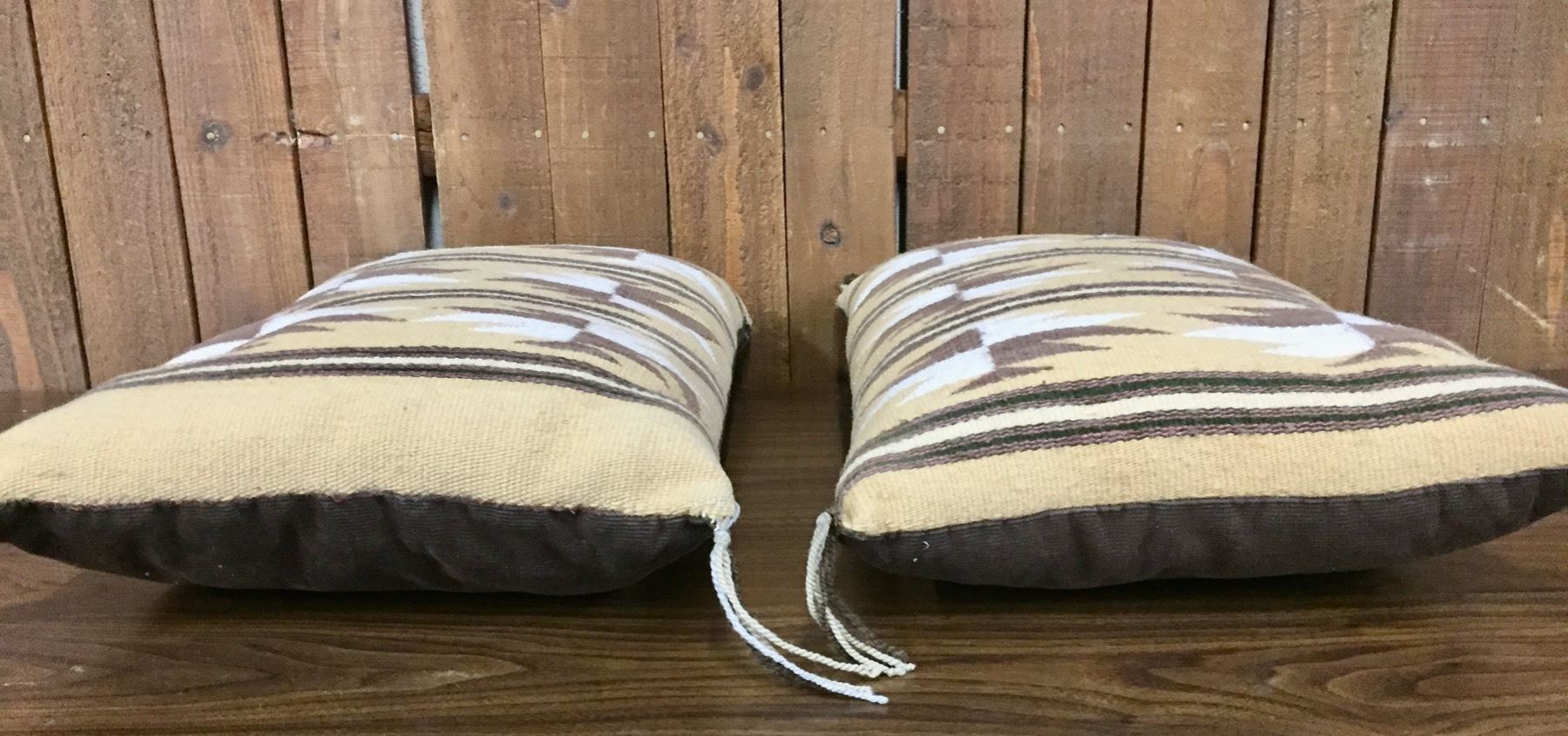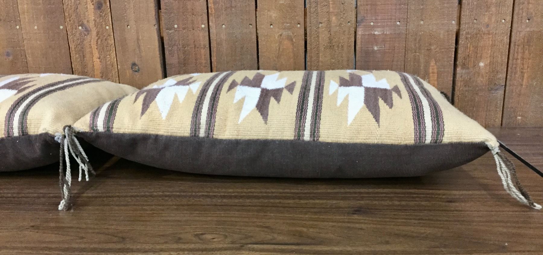 Description: Offered for sale in this lot we have two handmade Navajo textile pillows featuring geometric patterns in white, golden yellow and tan base colors. Maker: Unknown Navajo weaver. Approx. Age: Vintage. Size: 20 inches wide x 13 inches tall. Condition: Good for their ages, normal wear expected. Please look closely at the pictures - they are an important part of our description. Shipping: There will be a $5 handling, packaging fee for shipping this lot. The actual cost of postage will be added on top of that.