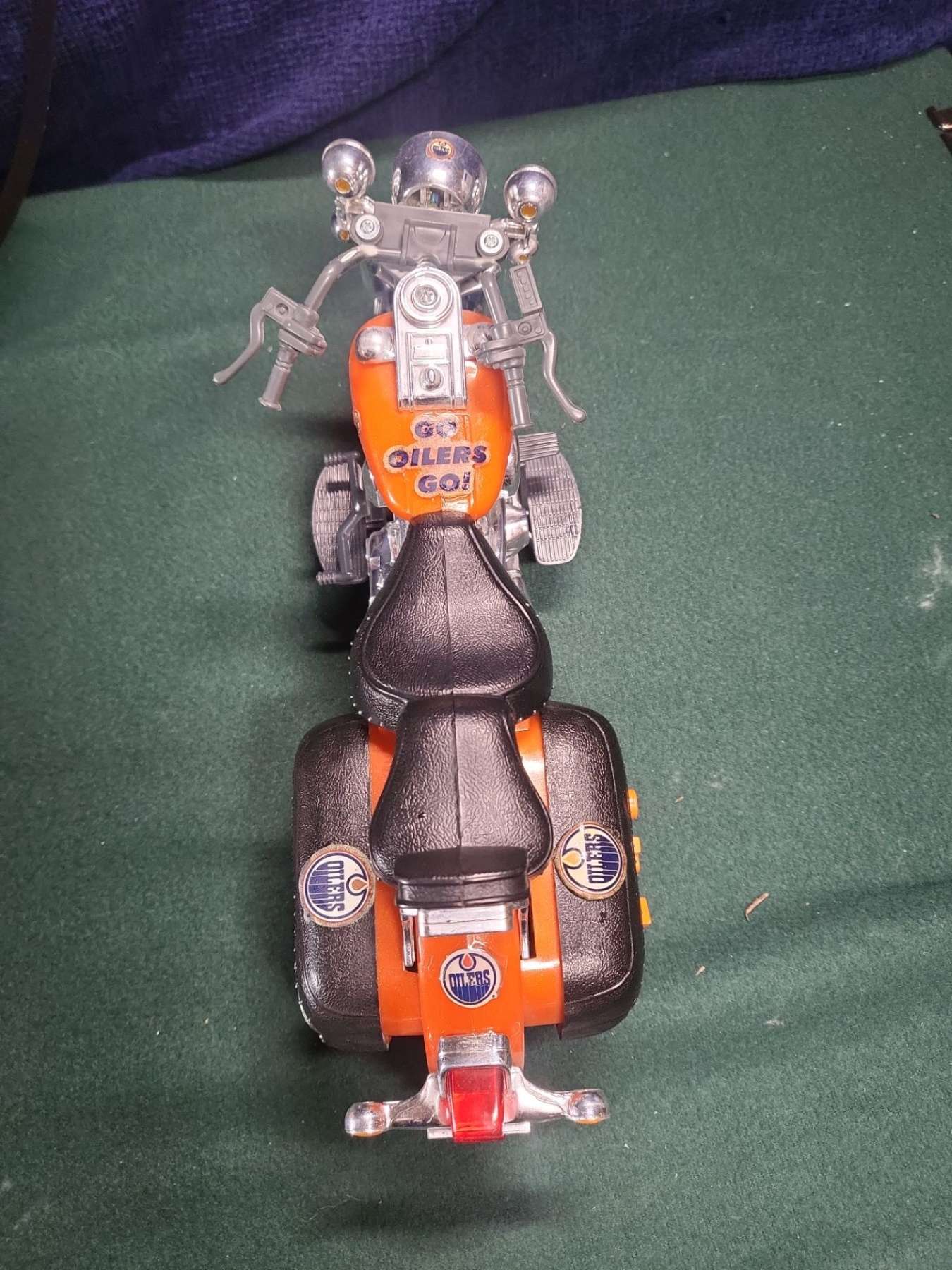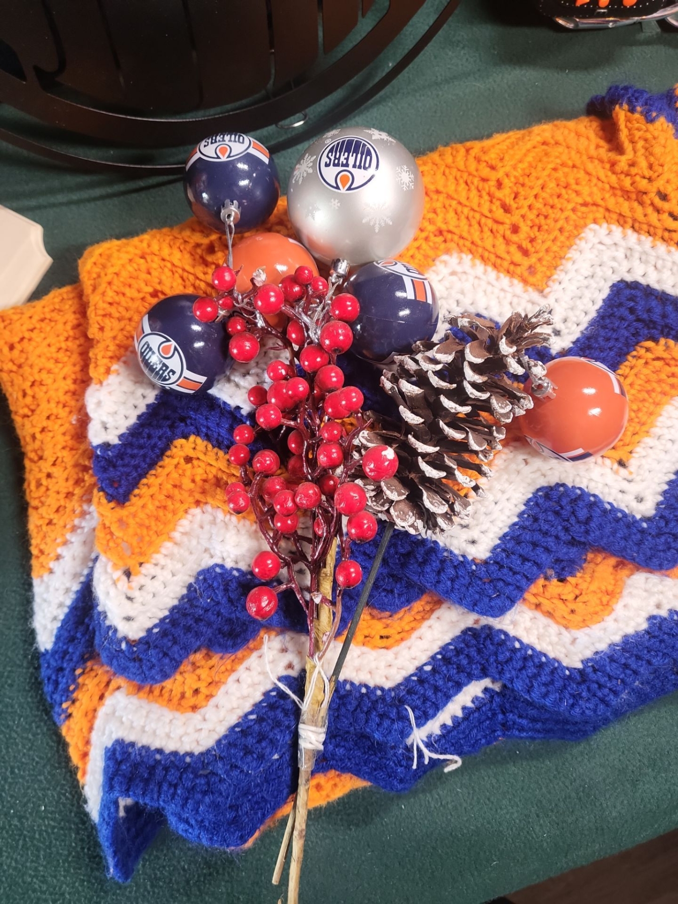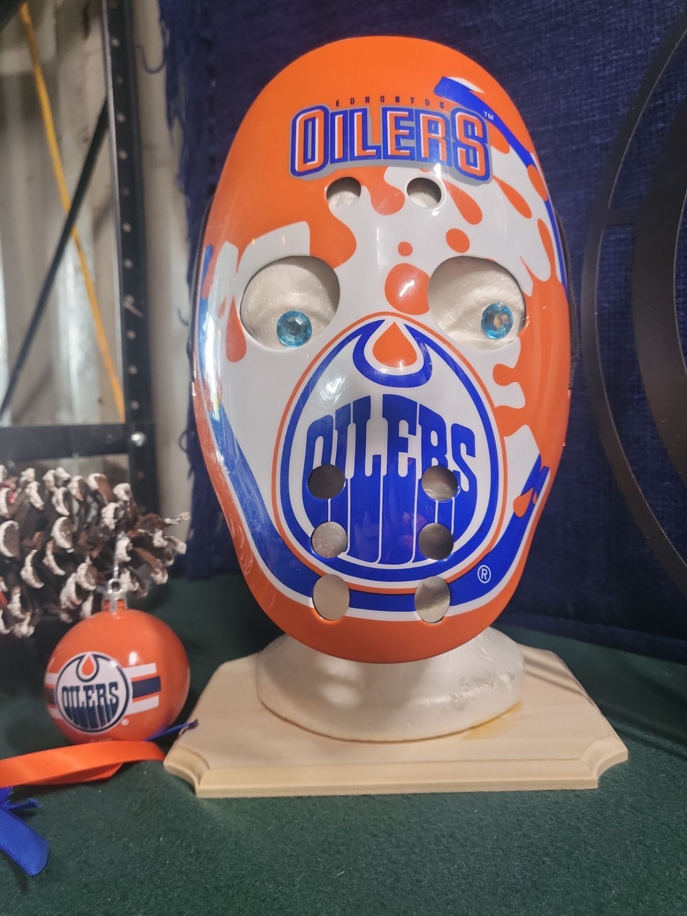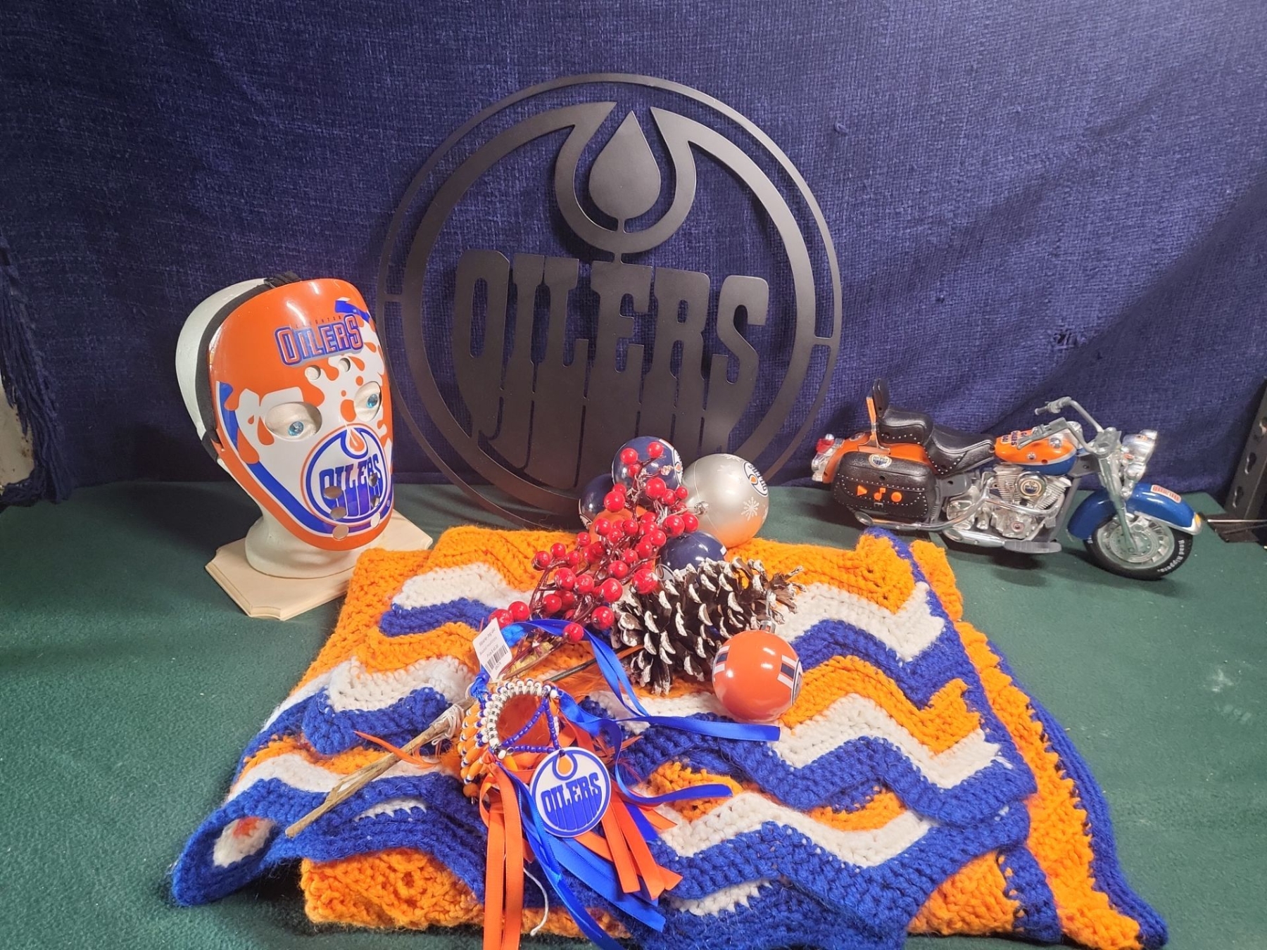 Handmade Oilers Blanket, Steel Sign, Oilers Mask, Toy Bike that Makes Noise
