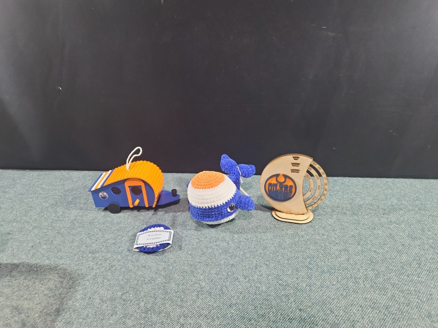 Handmade Oilers Gifts, Kitchen Scrubbie, Bird Feeder, Stuffed Crochet Whale, Laser Engraved Calendar
