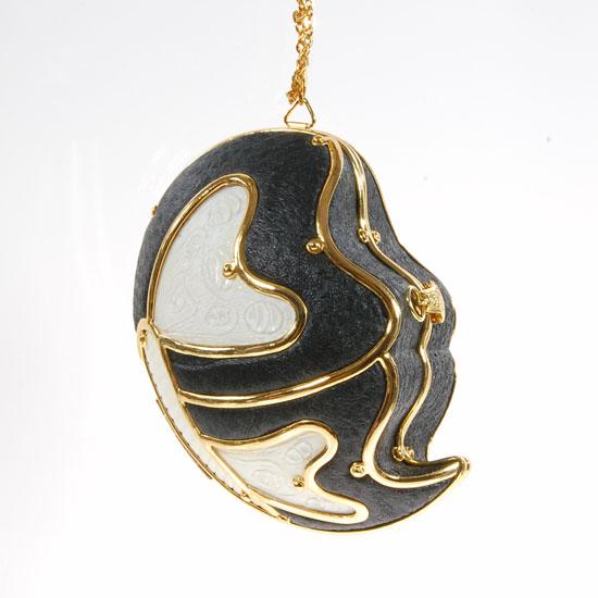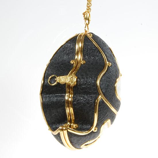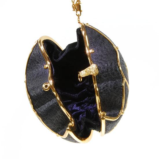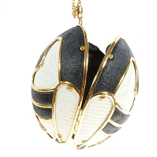 Unique parrot shaped clutch handbag made of ostrich egg shell. With gilded hardware and ostrich hide. Crafted in the shape of a parrot . Sturdy; built to last and a truly useable; collectible accoutrement. 6"; $1595 retail