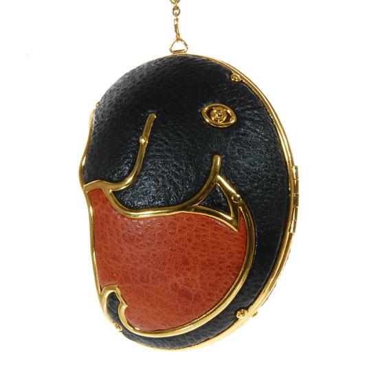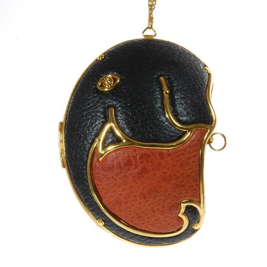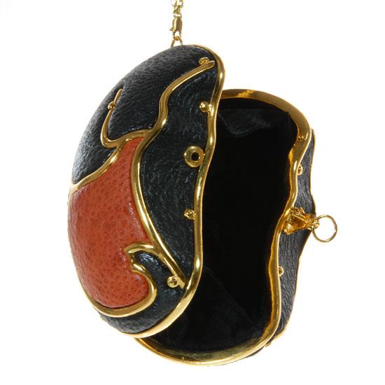 Unique parrot shaped clutch handbag made of ostrich egg shell. With gilded hardware and ostrich hide. Crafted in the shape of a parrot . Sturdy, built to last and a truly useable, collectible accoutrement. 6"