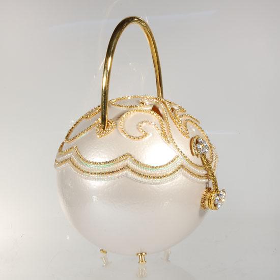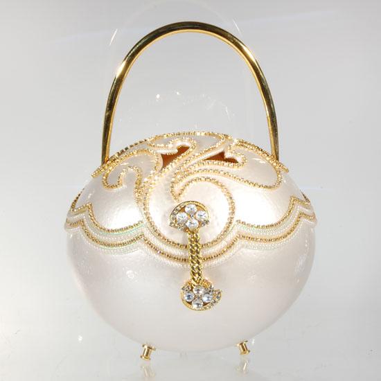 Handmade unique ostrich egg handbag. Sturdy, built to last and one of a kind. Adorned with gold plated hardware, rhinestone and pearl. 6" long and velvet lined. A truly useable, collectible accoutrement.