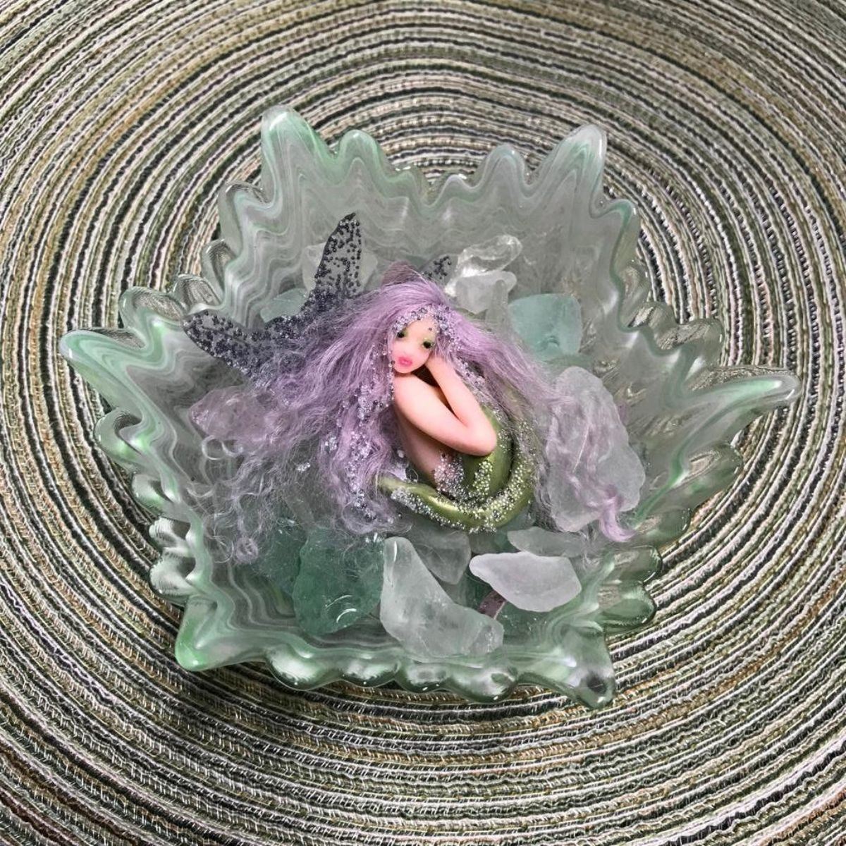 Beautiful artisan handmade polymer clay, mermaid with lavender hair fantasy doll by Rhonda Allen, displayed in green glass dish on sea glass shards. 5 3/4" D X 2 1/2" H dish, 3 1/2" mermaid doll.