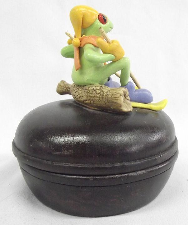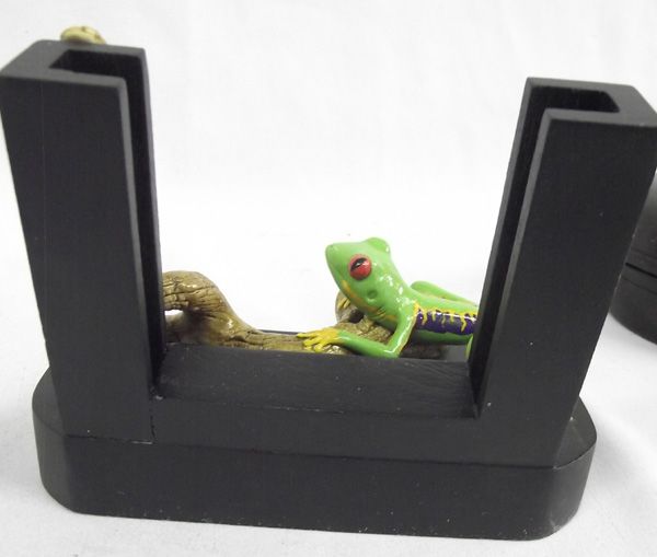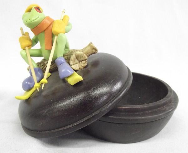 Handmade Polymer Desk Set - Tree Frog Skiing Frog. Hand formed polymer clay skiing frog sits on top of a turned mango wood box - perfect for storing paperclips or coins. The red-eyed tree frog (same composition) is sitting on a wooden business card holder. Perfect for desk or gifts. box is 5'' diameter x 4.5''H. Card holder is 4''H x 5.5''W.