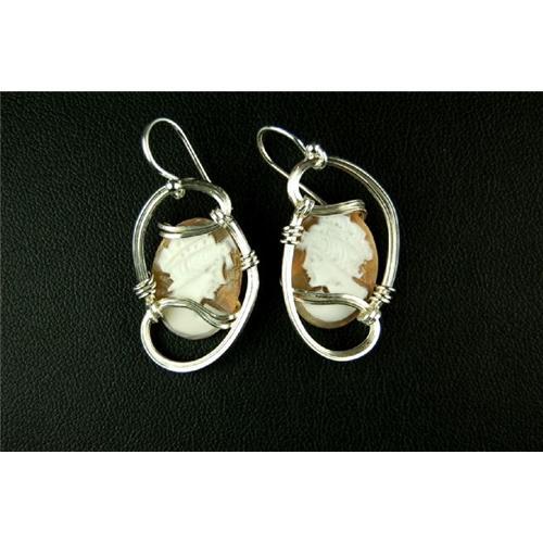 Handmade STERLING Silver Earrings each featuring a Hand Carved Sardonyx Shell CAMEO of the profile of a woman. The Earrings measures 1" in length and they have wire tops for pierced ears.
