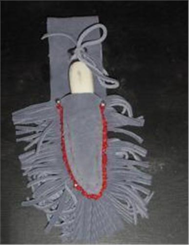 Handmade Blue deer hide knife sheath with red glass and brass beads. 15.5 in over all length, 7 in wide. Knife blade is 3.5 in. long.