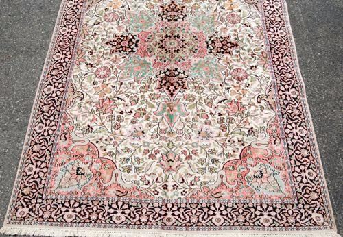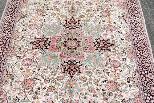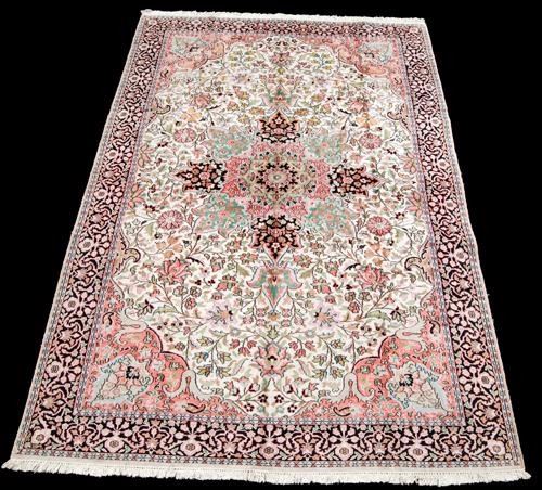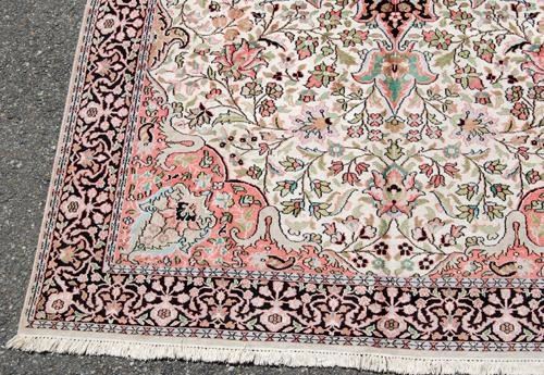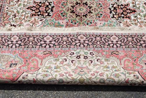 MADE OF SOFT LAMB'S WOOL/PART PURE SILK PILE ON COTTON FOUNDATION, ALL NATURAL VEGETABLE DYE, THIS STRIKING RUG UTILIZES A RICH AND DEEPLY DETAILED FLORAL KASHAN DESIGN RUG, WITH A FOUR SIDED CENTRAL MEDALLION; FINELY DONE CROWNED CORNERS AND FRAMED BEAUTIFULLY BY AN INTRICATELY DONE FLORAL BORDER. HAND WOVEN BY A MASTER CARPET WEAVER, THIS STRIKING RUG INCORPORATES A RICH AND VARIED COLOR PALETTE THAT IS NOT USUALLY FOUND IN ORIENTAL RUGS. SIZE 5.1 X 9.3 FEET. THE SILK HIGHLIGHTS OF THIS RUG ALSO GIVE THIS AN EXTRA LAYER OF BEAUTY AND AESTHETIC APPEAL.