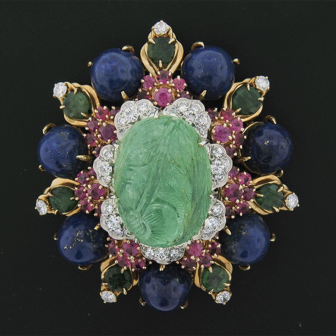 Handmade Solid Gold GIA Carved Emerald Lapis Ruby Diamond Floral Pin Brooch