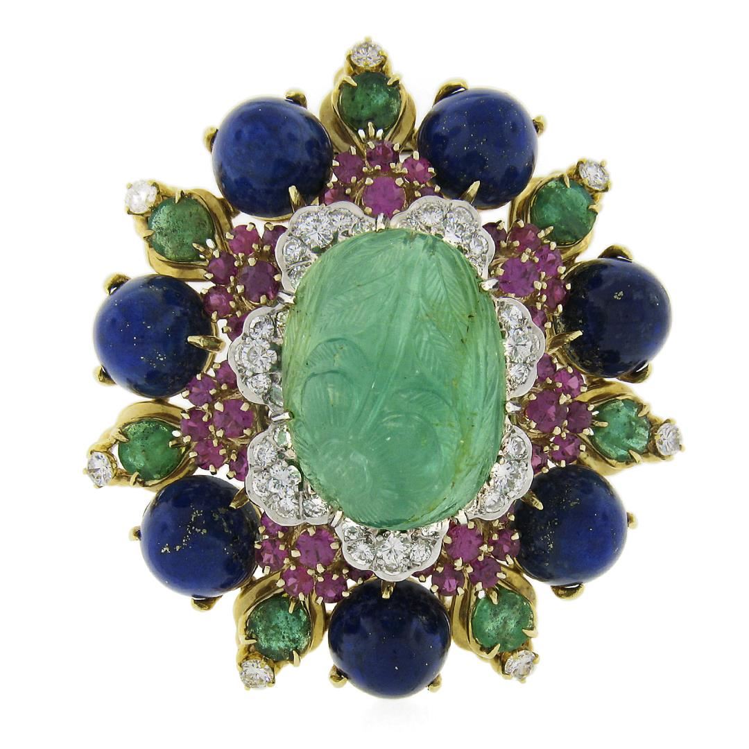 A solid 16k yellow & white fold handmade brooch, featuring 1 GIA graded carved oval natural emerald (40-50ct ), 7 round bead natural lapis lazuli (10mm), 35 round cut natural ruby (3ctw), 7 round cut natural emeralds (3.36ctw), and 49 round cut natural diamonds (G-I - VS2-SI2 ; 1.86ctw). Measures 53.8x49.6mm and weighs a total of 44.9 grams. Comes with all original relevant certifications.