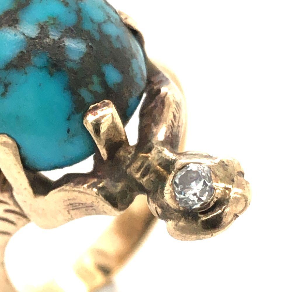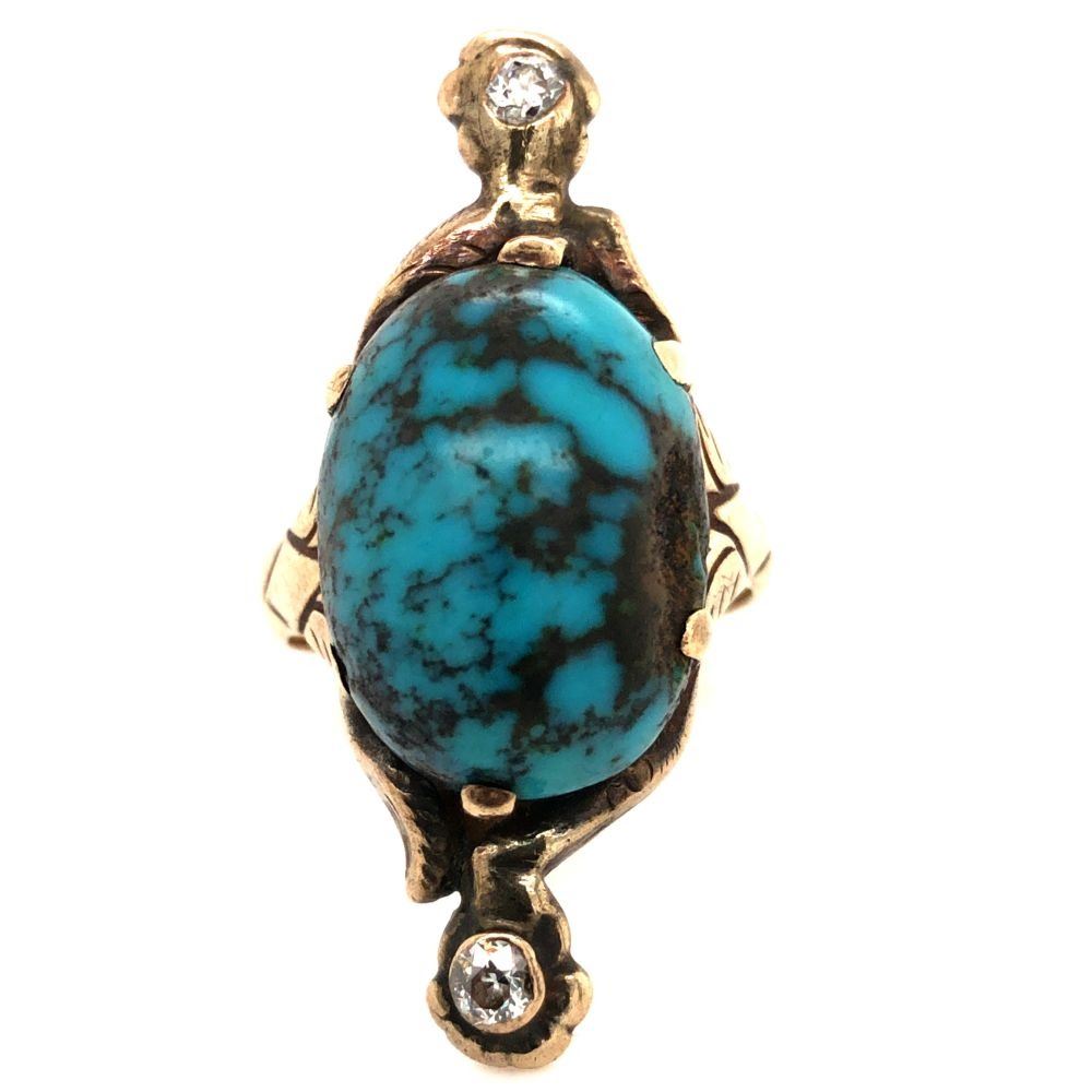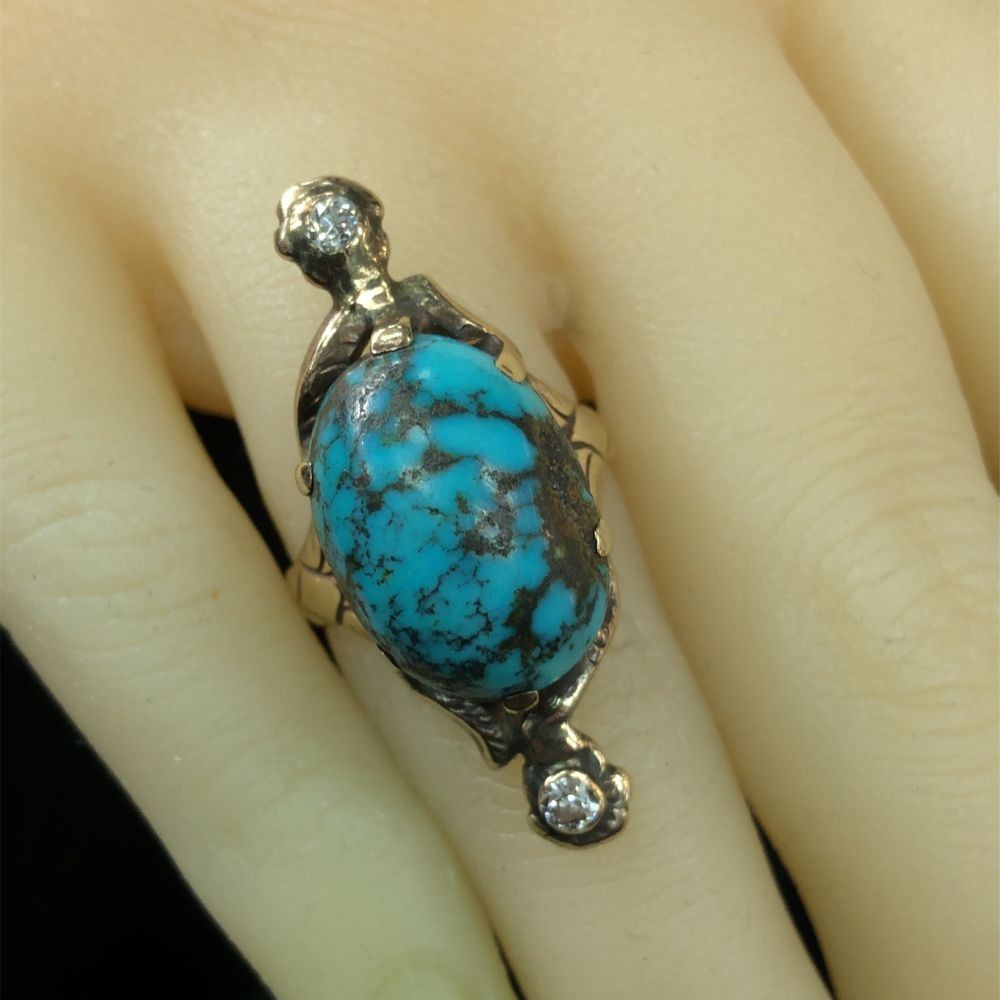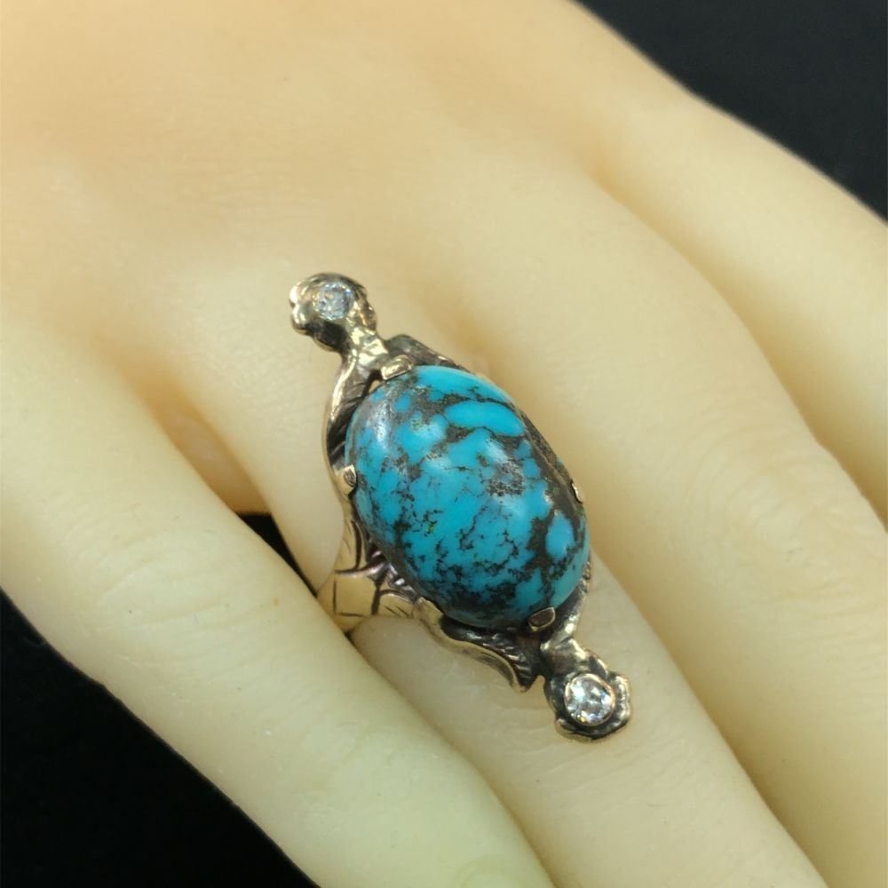 This is an electronically tested 12K-14K gold ring with polished turquoise and natural diamonds. The ring is circa early 1900's and features an approximate 16 mm x 12 mm cabochon Spiderweb turquoise and two Mine-cut diamonds. The ring is US size 6. This is a preowned item in estate condition.