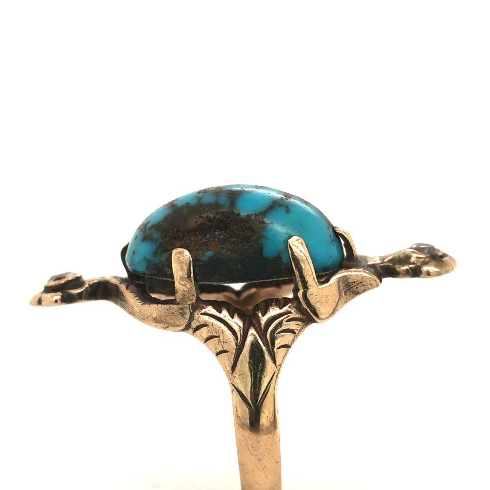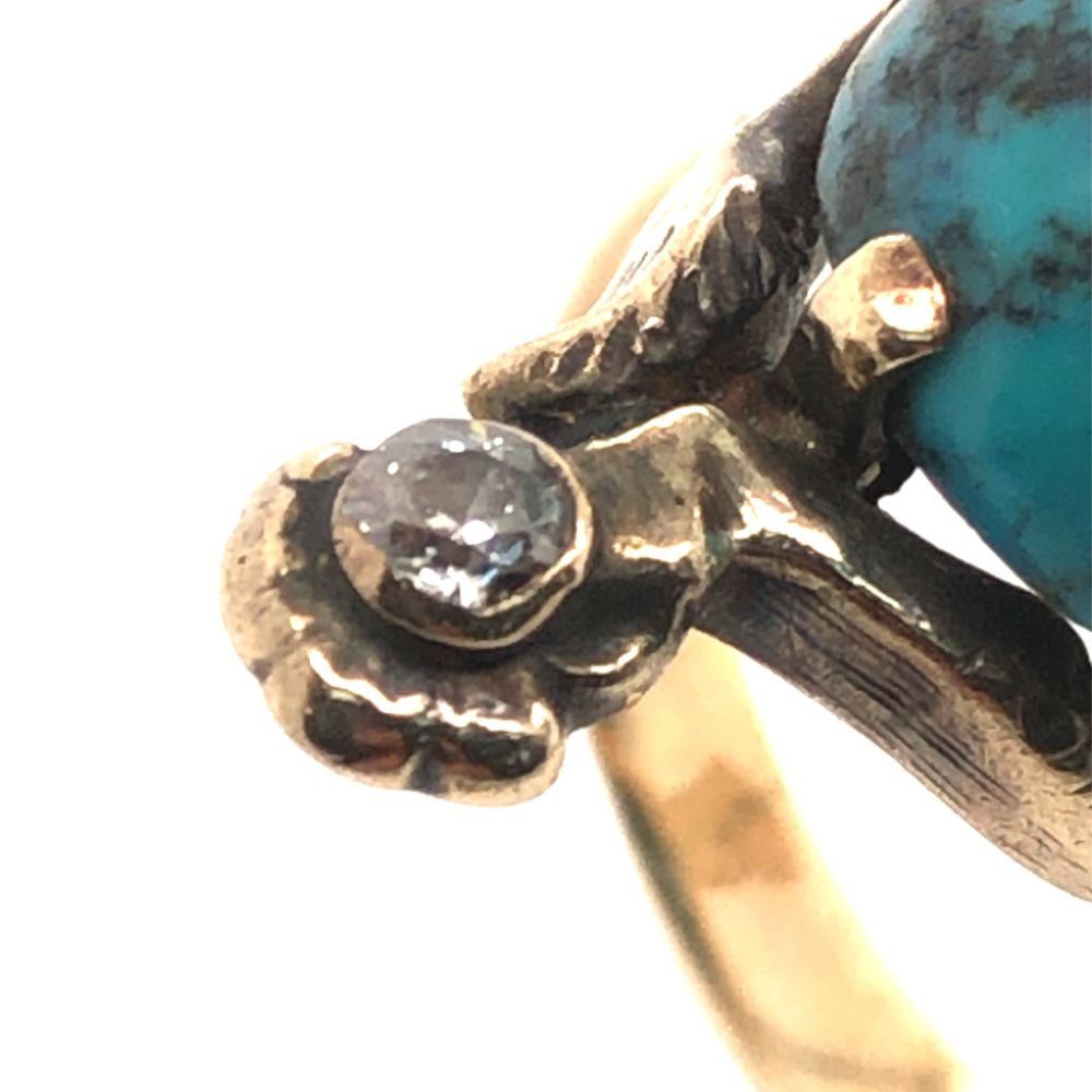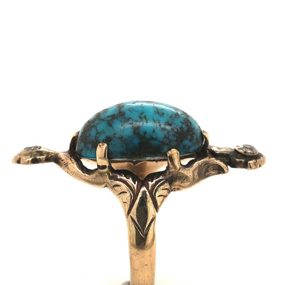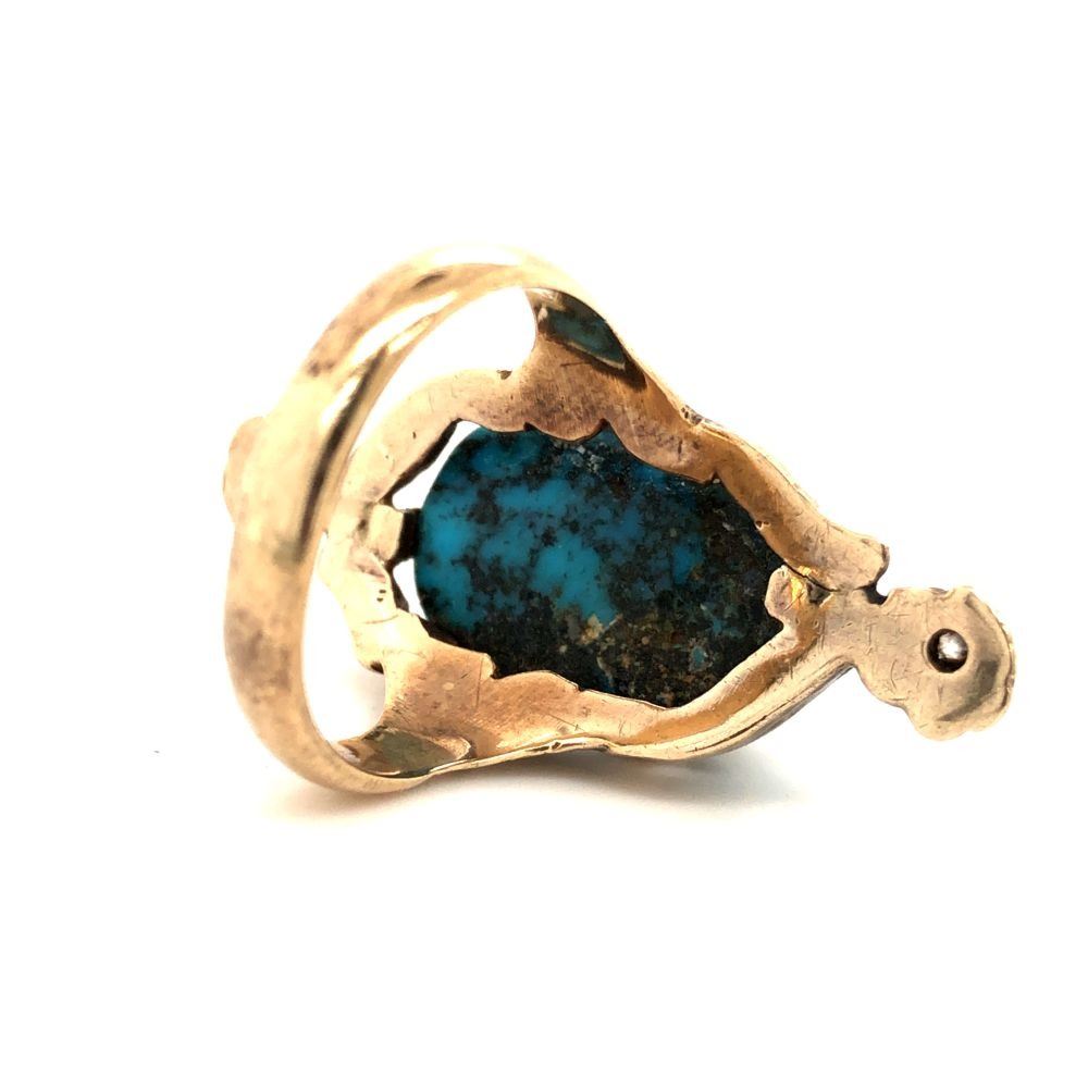 This is an electronically tested 12K-14K gold ring with polished turquoise and natural diamonds. The ring is circa early 1900's and features an approximate 16 mm x 12 mm cabochon Spiderweb turquoise and two Mine-cut diamonds. The ring is US size 6. This is a preowned item in estate condition.