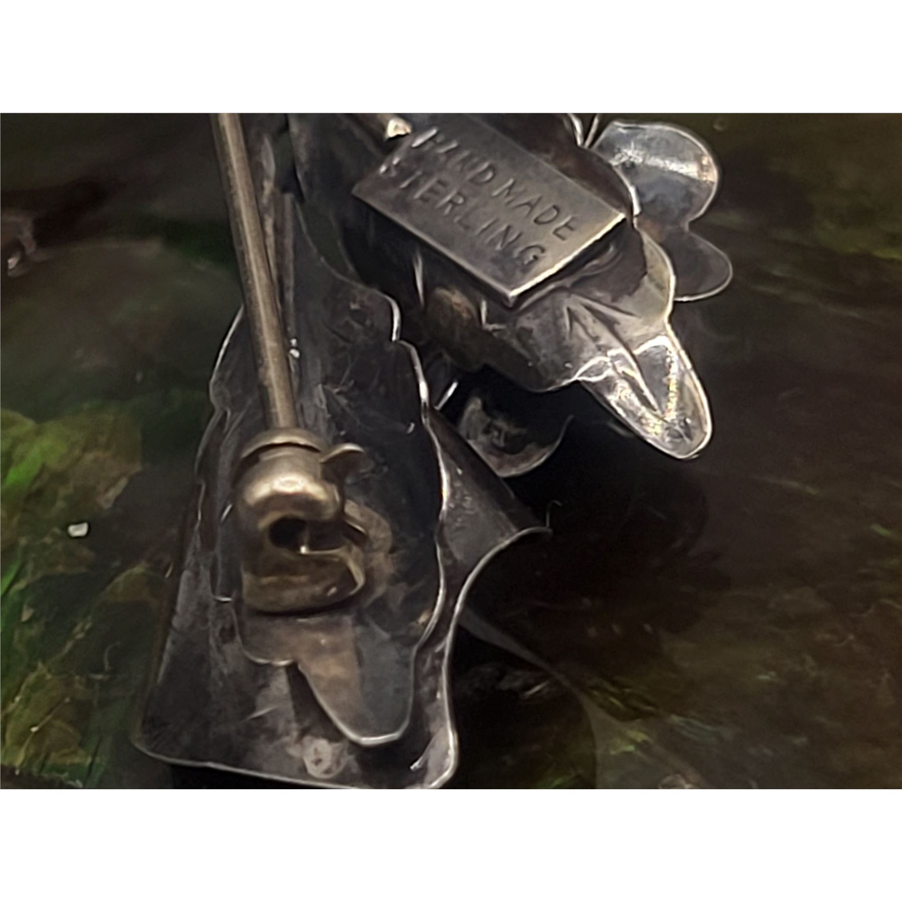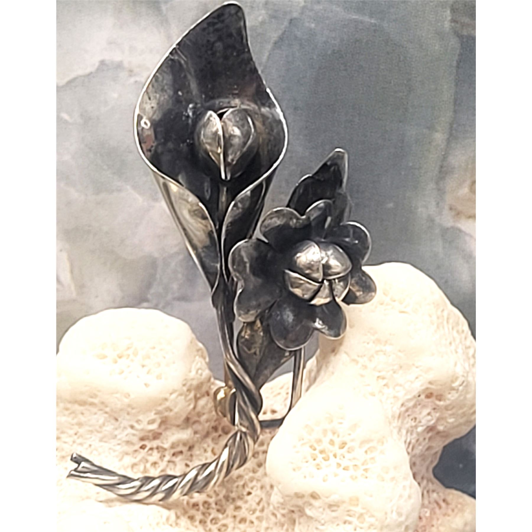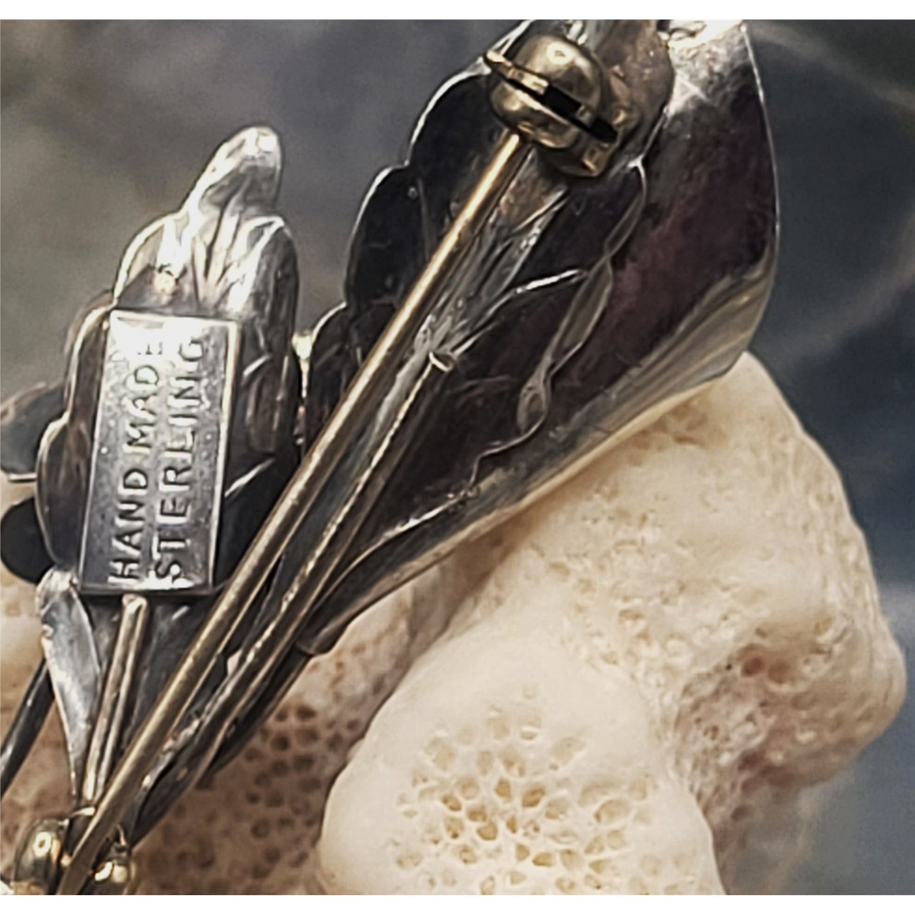 This vintage sterling silver brooch, pin is a work of art, as well as a piece of fine jewelry. The twisted stems end in a curve resembling the letter & quot;J& quot;. Fine sheets of sterling silver are cut into heart-shaped flower petals, and are curved into the budding centers.& nbsp; Even the backs of the flowers are etched with incredible detail of tendrils and venations.& nbsp; The brooch is approximately 1& quot; long and has a locking & quot;C& quot; clasp.