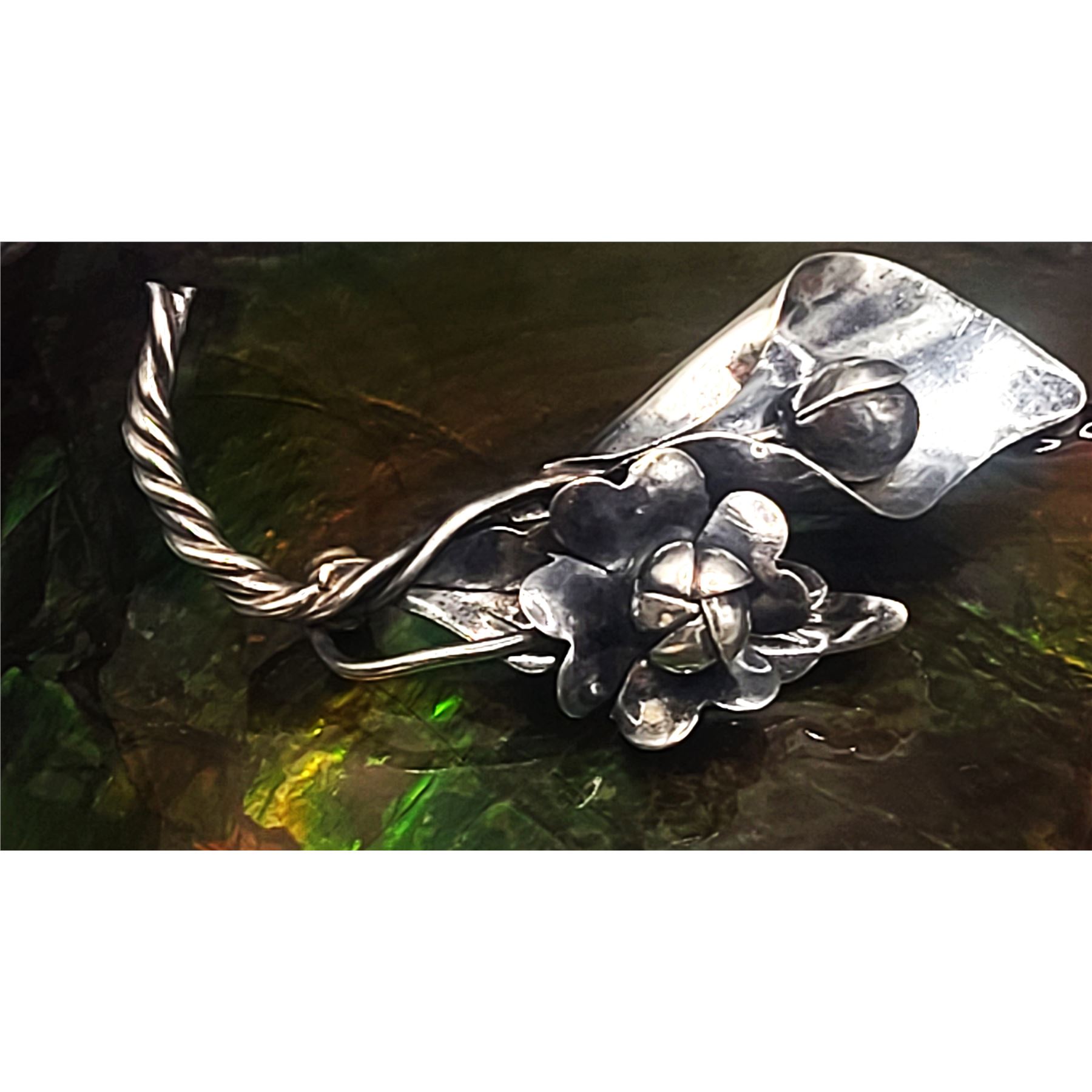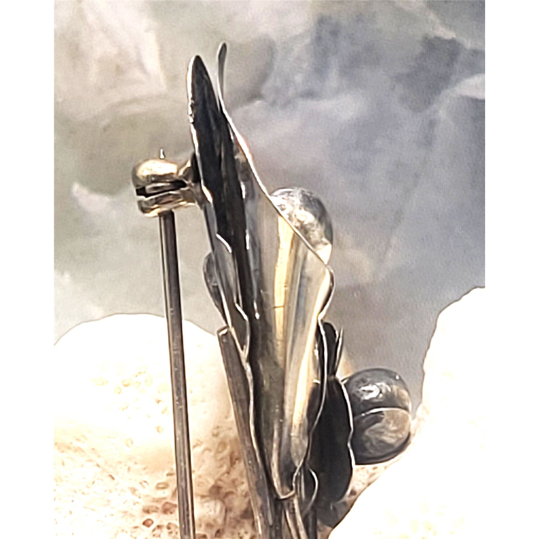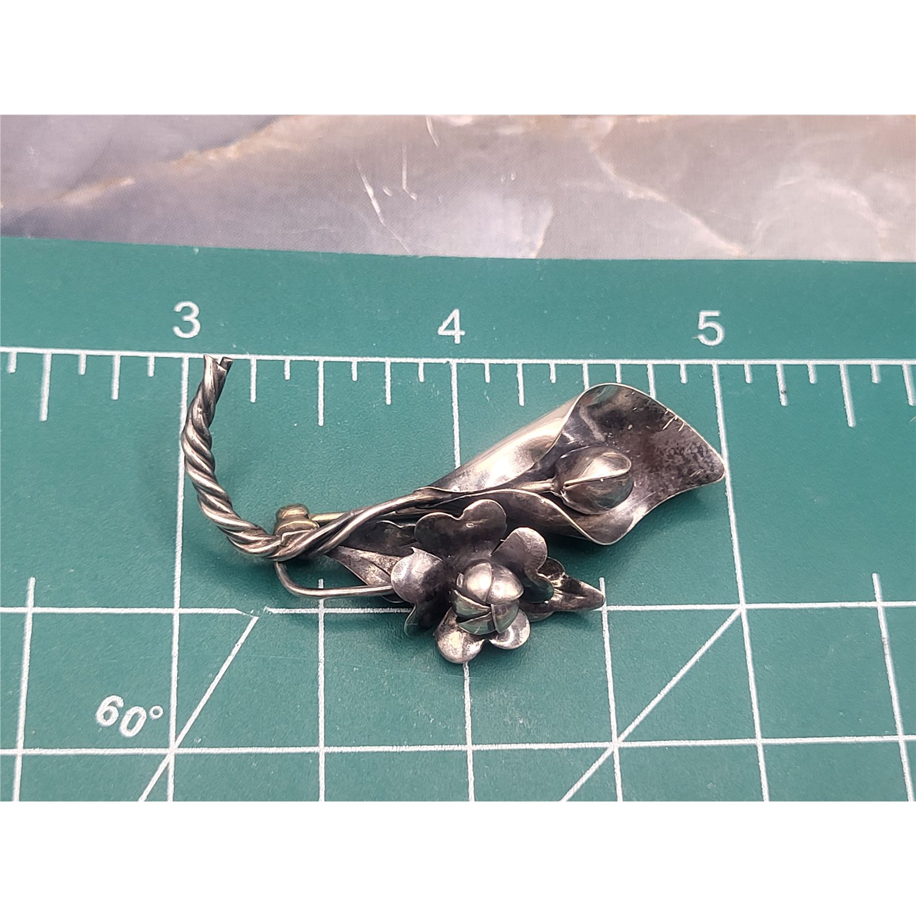 This vintage sterling silver brooch, pin is a work of art, as well as a piece of fine jewelry. The twisted stems end in a curve resembling the letter & quot;J& quot;. Fine sheets of sterling silver are cut into heart-shaped flower petals, and are curved into the budding centers.& nbsp; Even the backs of the flowers are etched with incredible detail of tendrils and venations.& nbsp; The brooch is approximately 1& quot; long and has a locking & quot;C& quot; clasp.