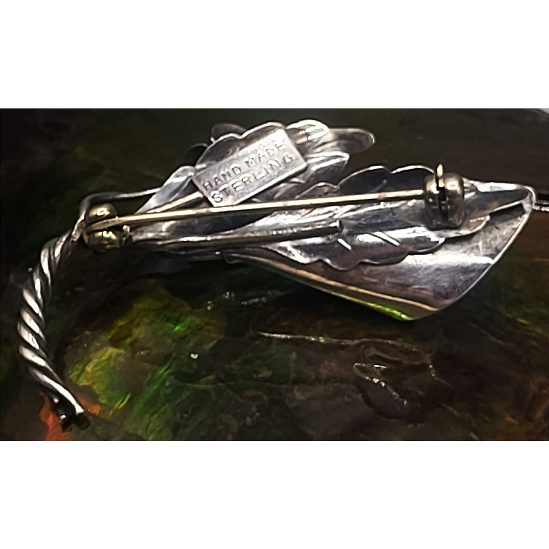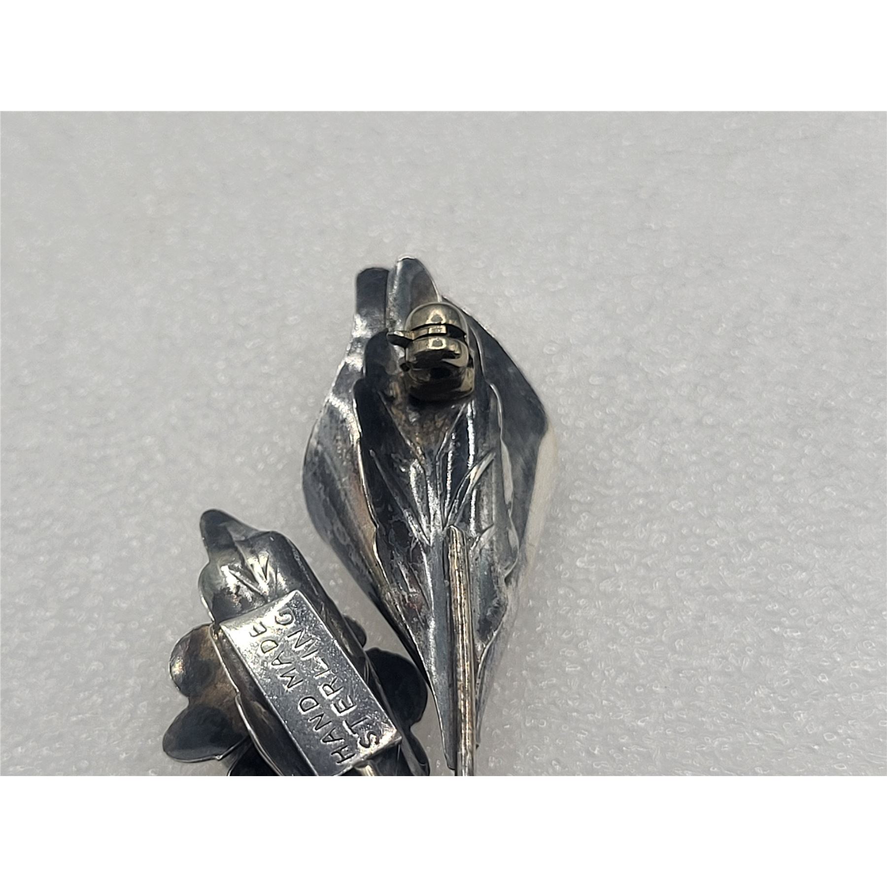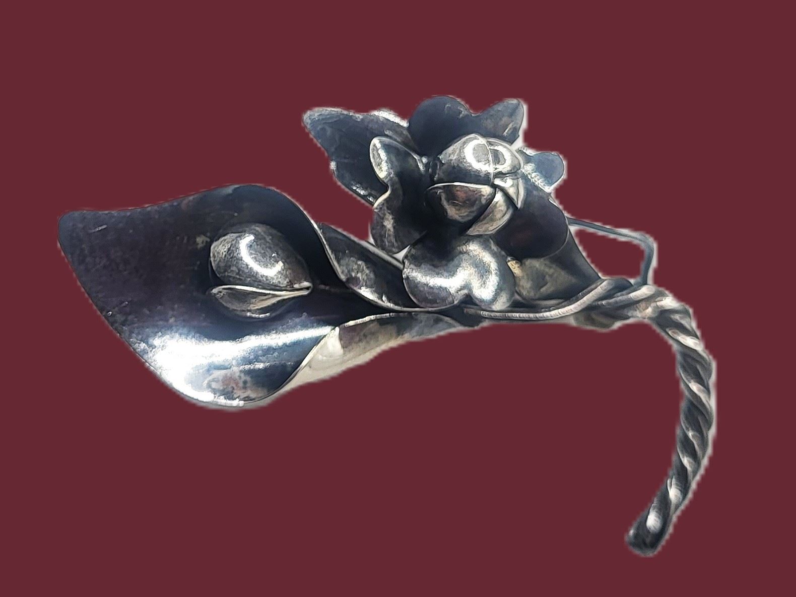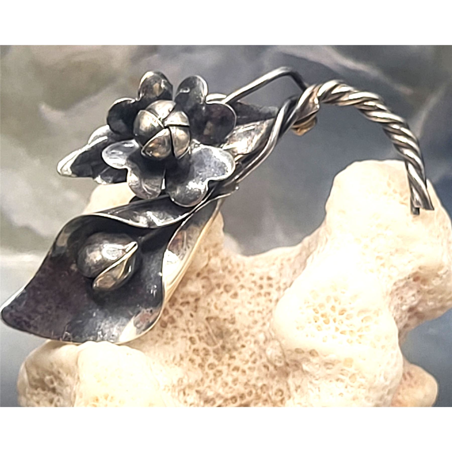 This vintage sterling silver brooch, pin is a work of art, as well as a piece of fine jewelry. The twisted stems end in a curve resembling the letter "J". Fine sheets of sterling silver are cut into heart-shaped flower petals, and are curved into the budding centers. Even the backs of the flowers are etched with incredible detail of tendrils and venations. The brooch is approximately 1" long and has a locking "C" clasp.