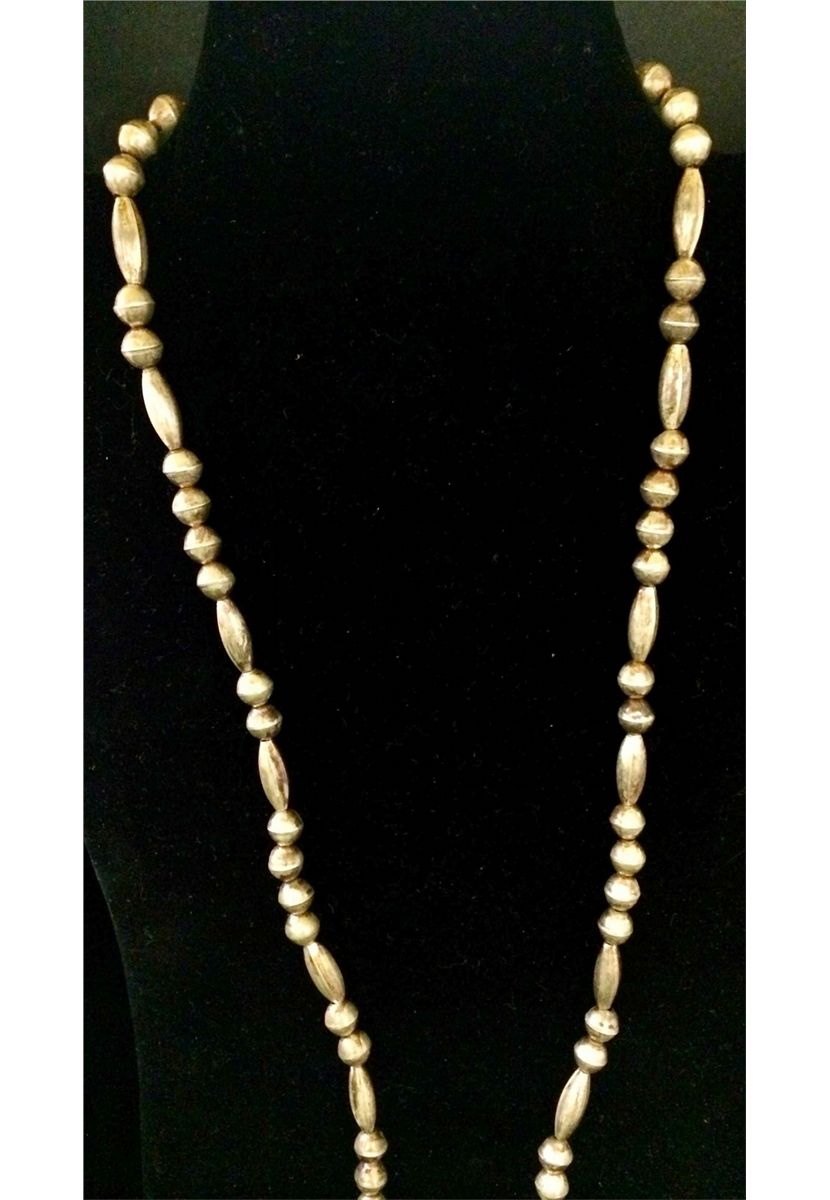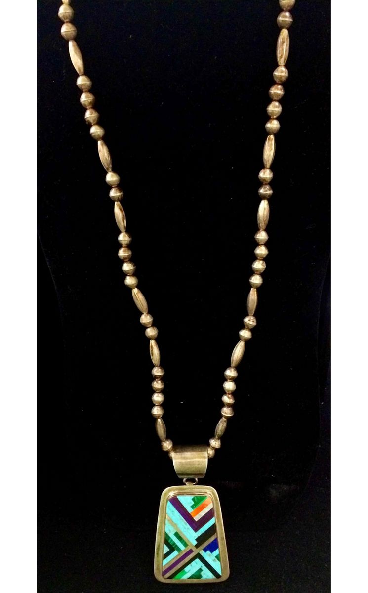 This beautiful necklace has a 26” sterling silver, handmade, bead (chain) and a channel inlay pendant with turquoise, malachite, lapis, sugalite and onyx in it. There is a hallmark of RC on the reverse and it weighs 77.5 g.