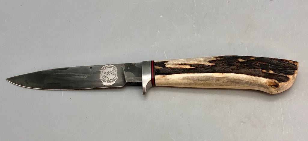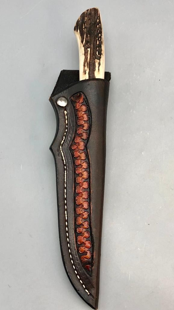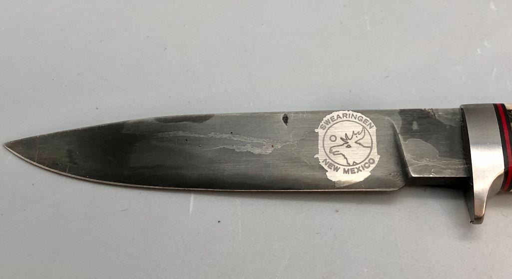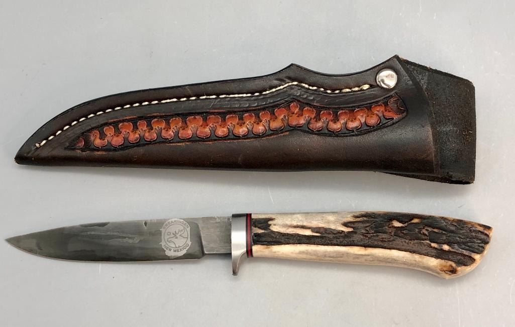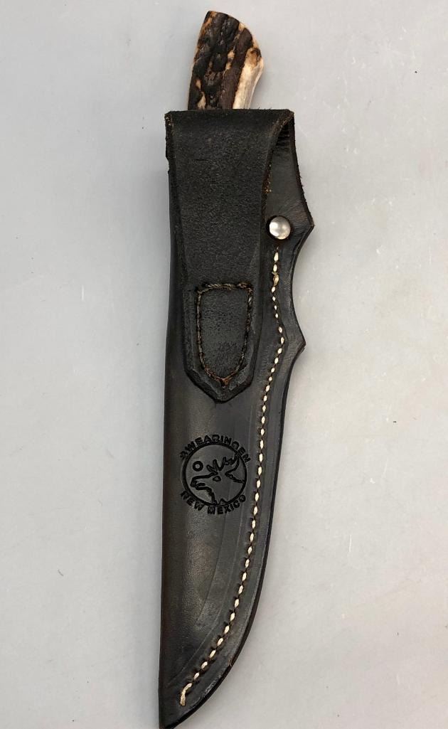 Up for consideration is a handmade Swearingen knife with an antler handle and a dark leather, hand tooled sheath. MAKER: K. A. Swearingen, Angel Fire, NM. APPROX AGE: Fairly Modern. SIZE: Blade measures 4 inches with an overall length of 8-3/8 inches. CONDITION: Like new, minimal wear expected. Please look closely at the pictures as they are an important part of our description and are hereby incorporated into the description, specifically with regards to condition. SHIPPING: There will be a $8 handling / packaging fee for shipping this lot. The actual cost of postage will be added on top of that. BUY IT NOW: If you would like to buy this item now, without waiting for the auction day to bid on it, we do offer this option (which is available up to 48 hours before the actual auction starts). The “Buy it Now†price is the high estimate of this lot (plus applicable fees and the Buyer's premium is discounted to 10% when using the Buy it Now option). If you would like to exercise this option, you must contact us by email (or phone as long as you talk to someone live). Reference this lot number and your intention to "Buy it Now."