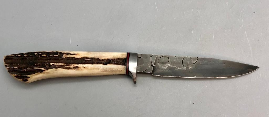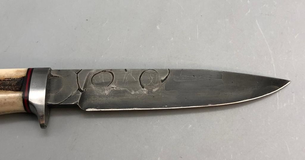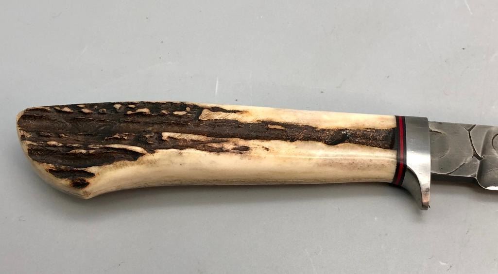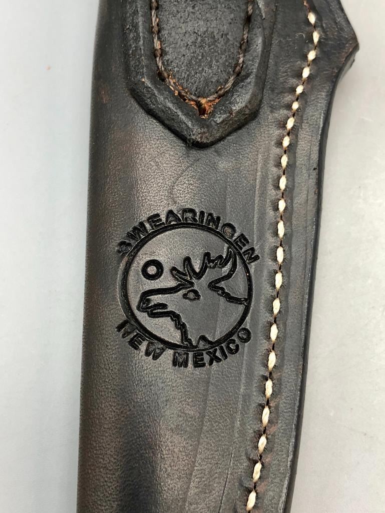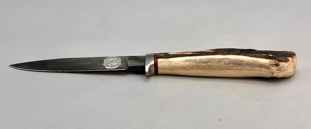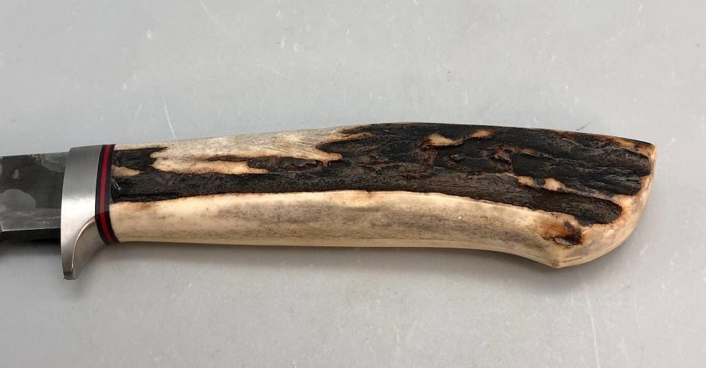 Up for consideration is a handmade Swearingen knife with an antler handle and a dark leather, hand tooled sheath. MAKER: K. A. Swearingen, Angel Fire, NM. APPROX AGE: Fairly Modern. SIZE: Blade measures 4 inches with an overall length of 8-3/8 inches. CONDITION: Like new, minimal wear expected. Please look closely at the pictures as they are an important part of our description and are hereby incorporated into the description, specifically with regards to condition. SHIPPING: There will be a $8 handling / packaging fee for shipping this lot. The actual cost of postage will be added on top of that. BUY IT NOW: If you would like to buy this item now, without waiting for the auction day to bid on it, we do offer this option (which is available up to 48 hours before the actual auction starts). The “Buy it Now†price is the high estimate of this lot (plus applicable fees and the Buyer's premium is discounted to 10% when using the Buy it Now option). If you would like to exercise this option, you must contact us by email (or phone as long as you talk to someone live). Reference this lot number and your intention to "Buy it Now."