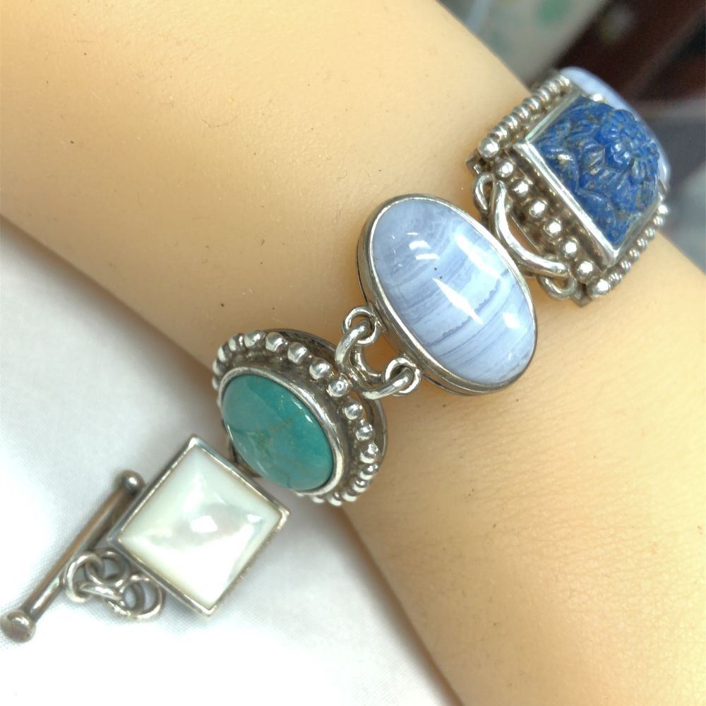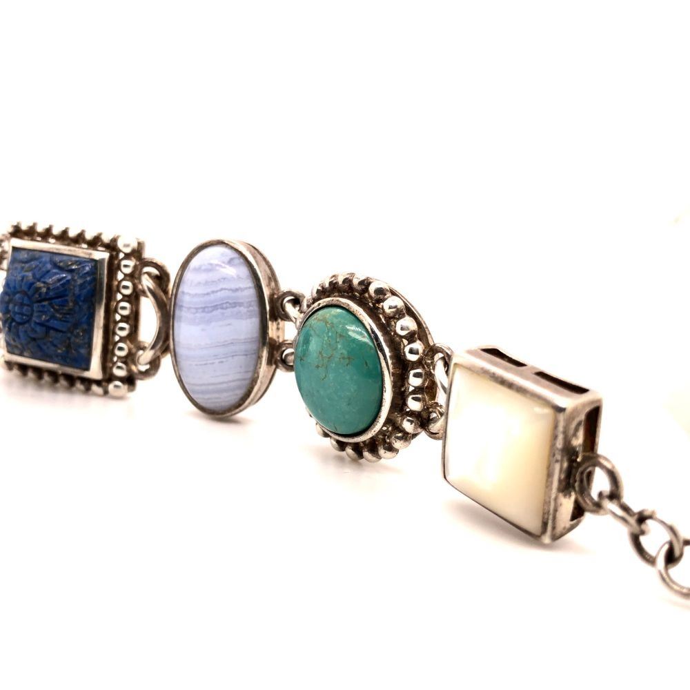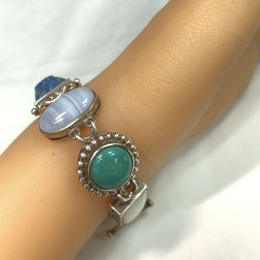 Handmade Vintage Turquoise, Lilac Jasper, Mother of pearl and carved lapis sterling silver Multi Stone Link BraceletSize 7 1/4" x 3/4 " adjustable