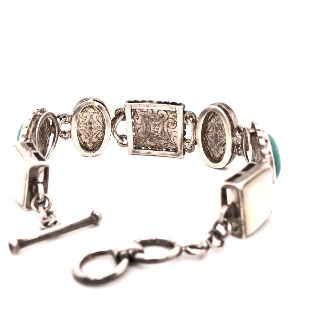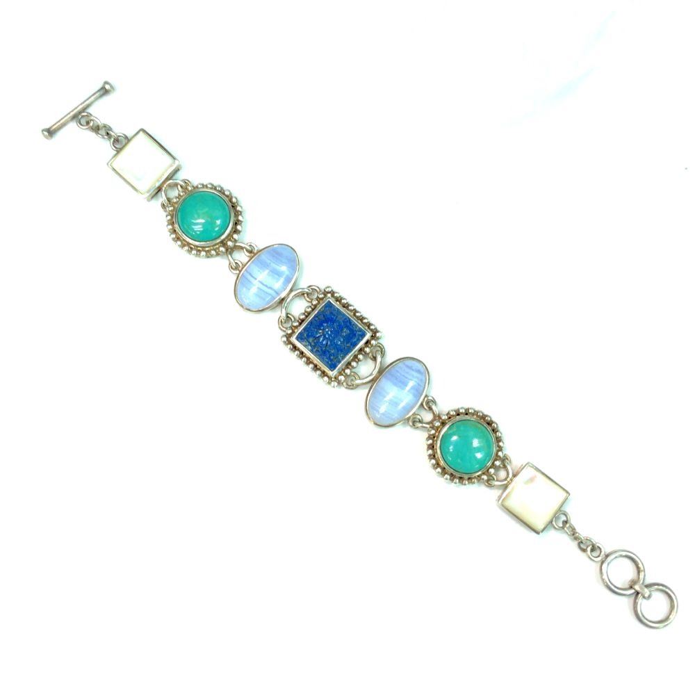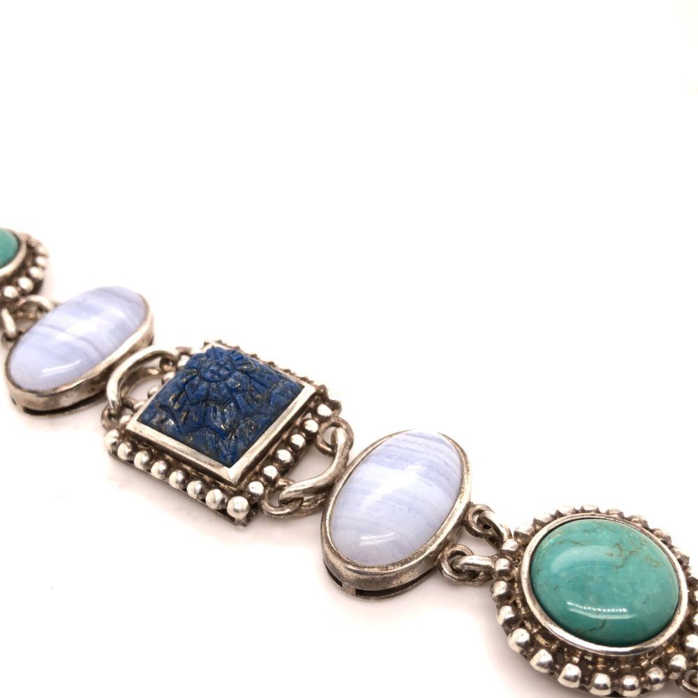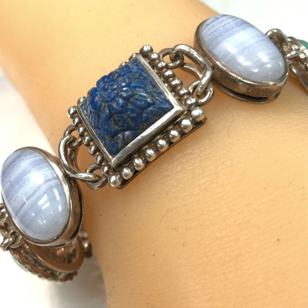 Handmade Vintage Turquoise, Lilac Jasper, Mother of pearl and carved lapis sterling silver Multi Stone Link BraceletSize 7 1/4" x 3/4 " adjustable