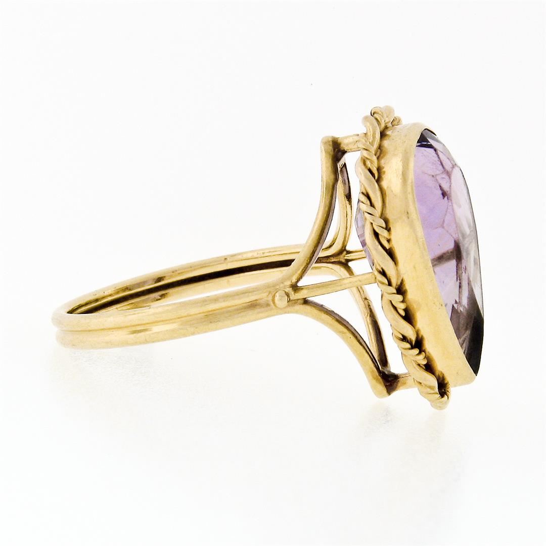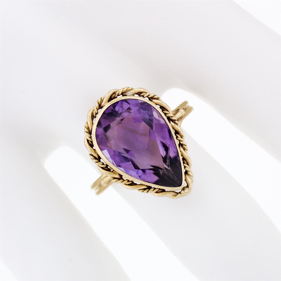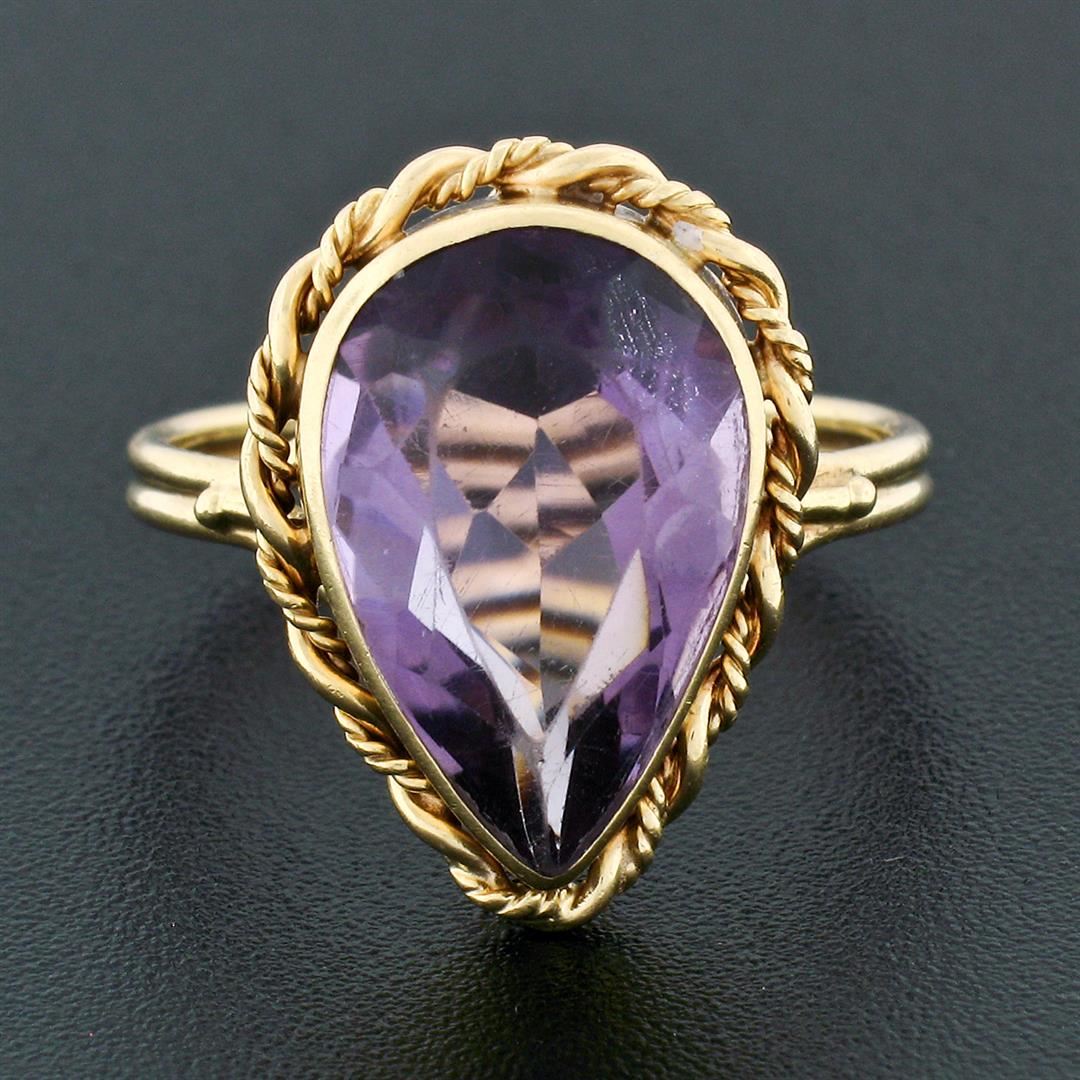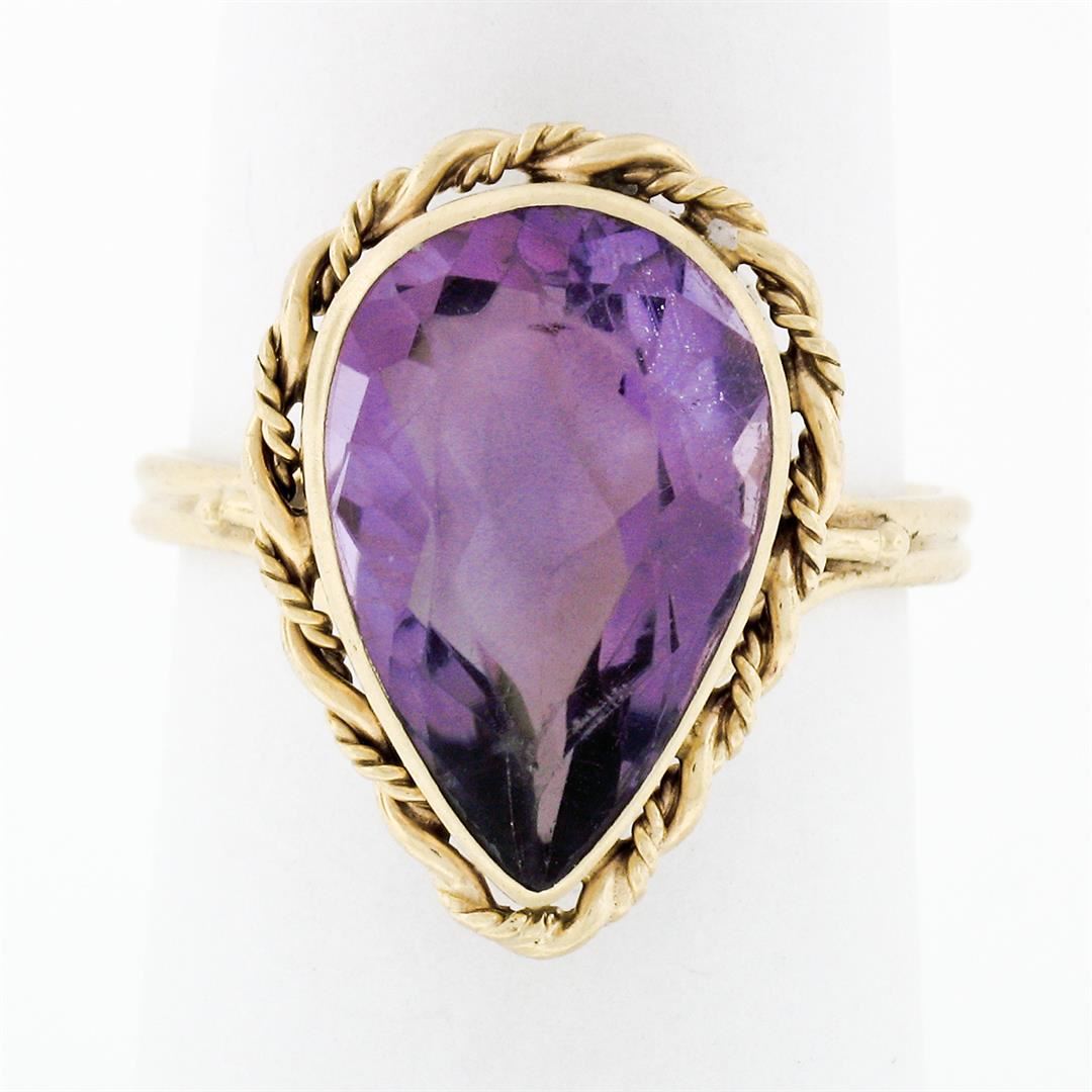 Handmade Vintage 14K Yellow Gold 5.50 ctw Pear Amethyst Ring w/ Twisted Wire Fra