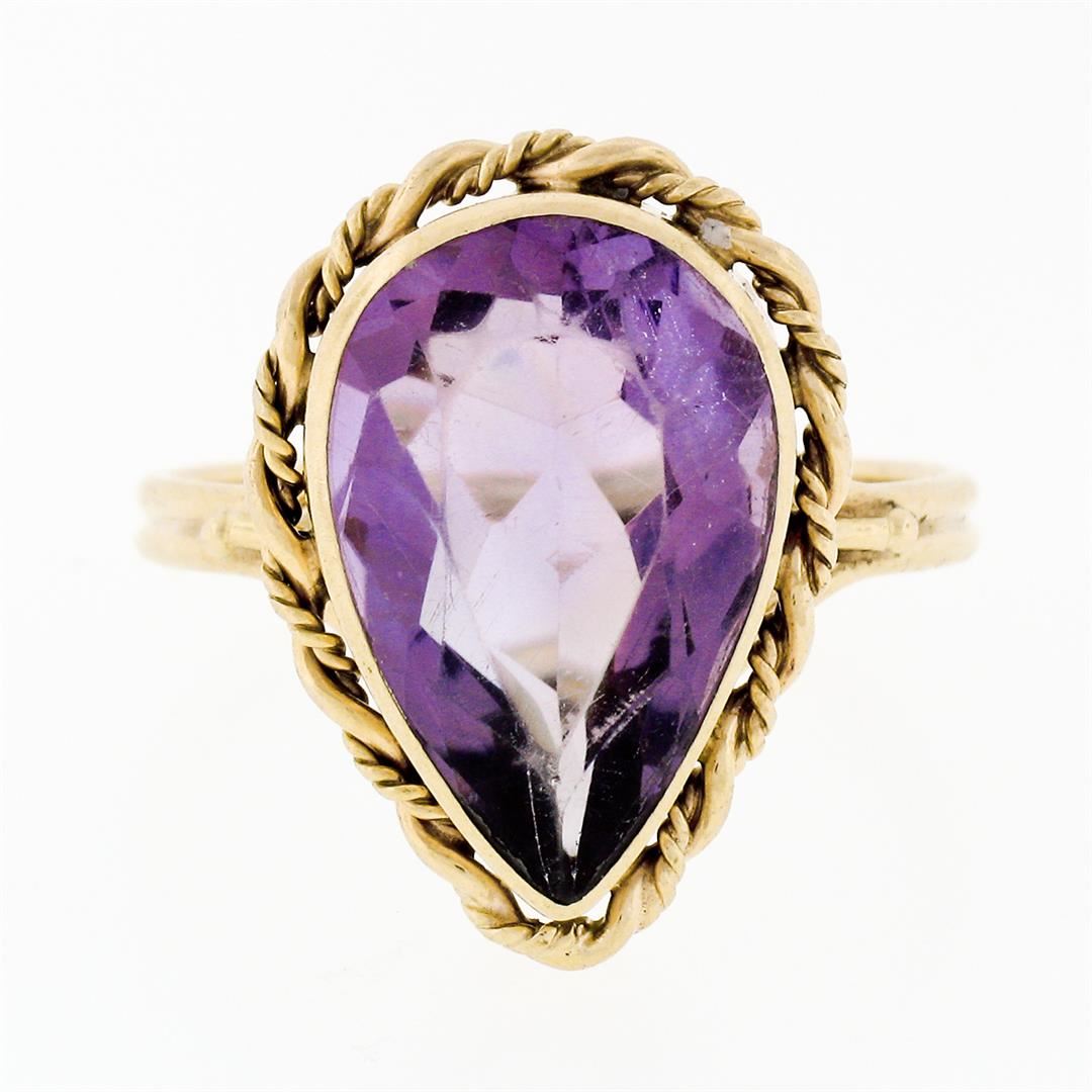 A vintage solid 14k yellow gold ring, with 1 pear cut natural amethyst (15.0x10.0mm - 5.50ctw ). The ring is size 7, weighs a total of 3.58 grams, and measures 18.50mm wide.