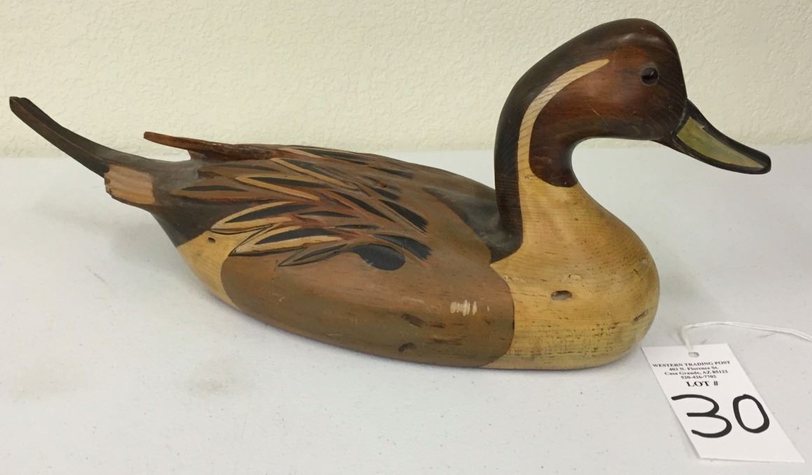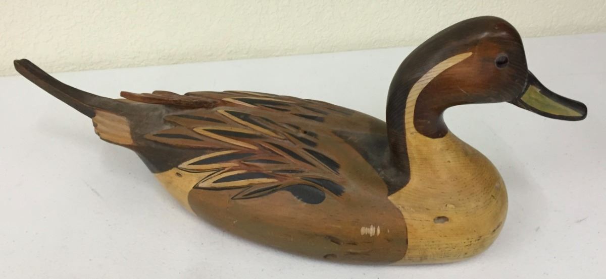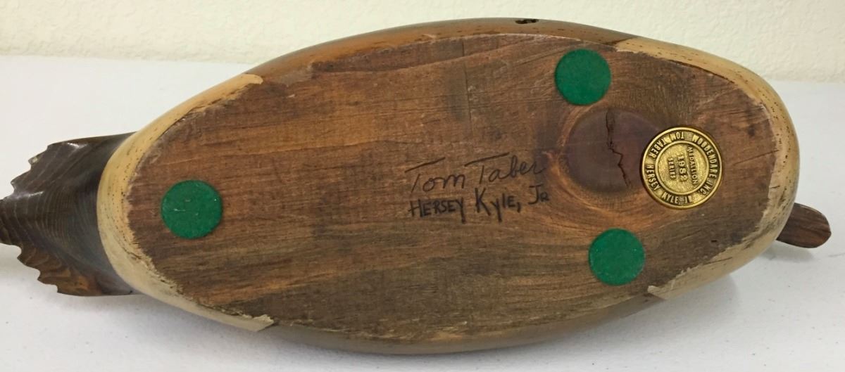 This decoy is signed Tom Taber and Hershey Kyle Jr. It measures 22” long by 8” high. Good vintage condition. Please look closely at the pics as they are an important part of our description. Shipping: There will be a $7 handling / packaging fee for shipping this lot. The actual cost of postage will be added on top of that.