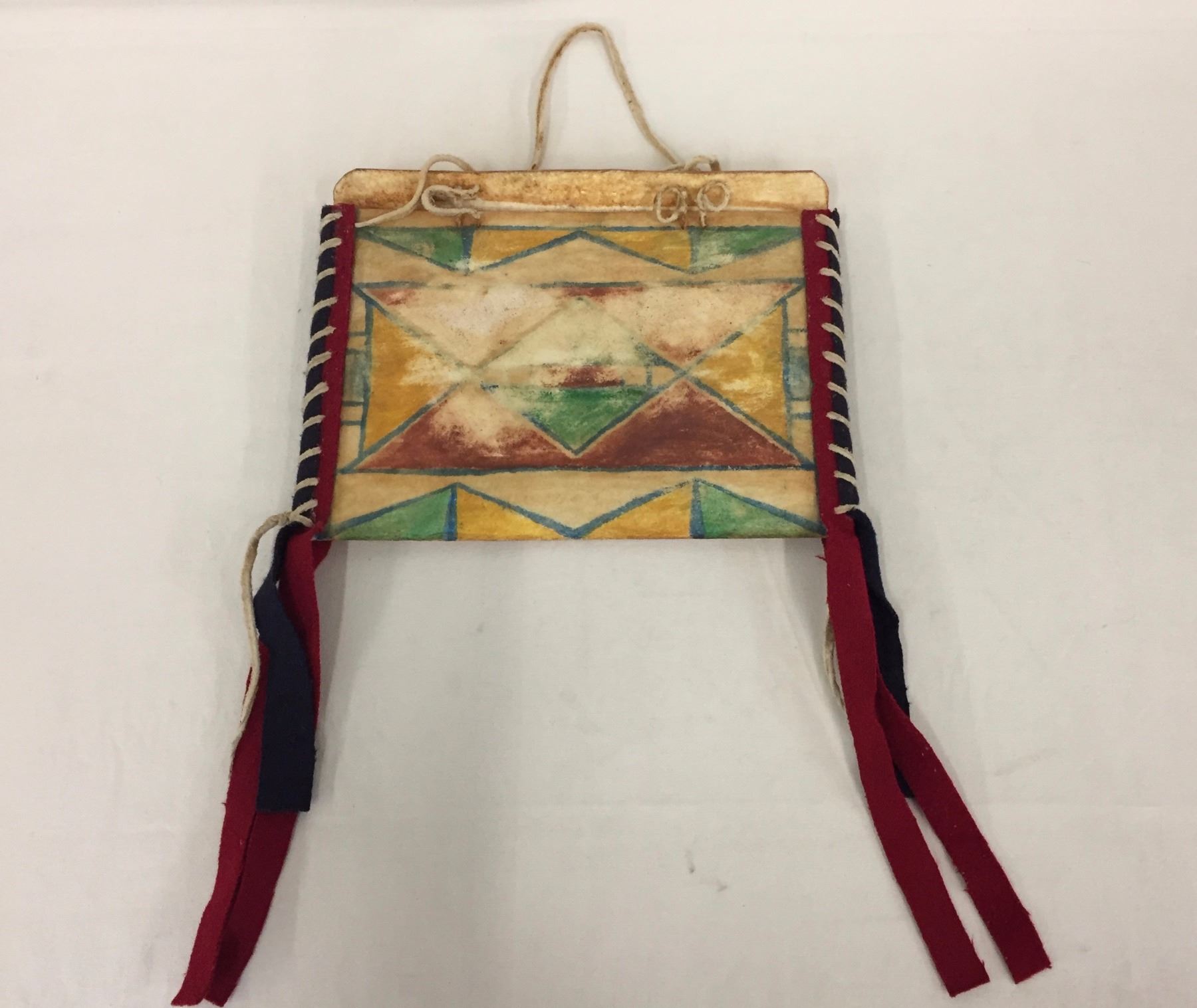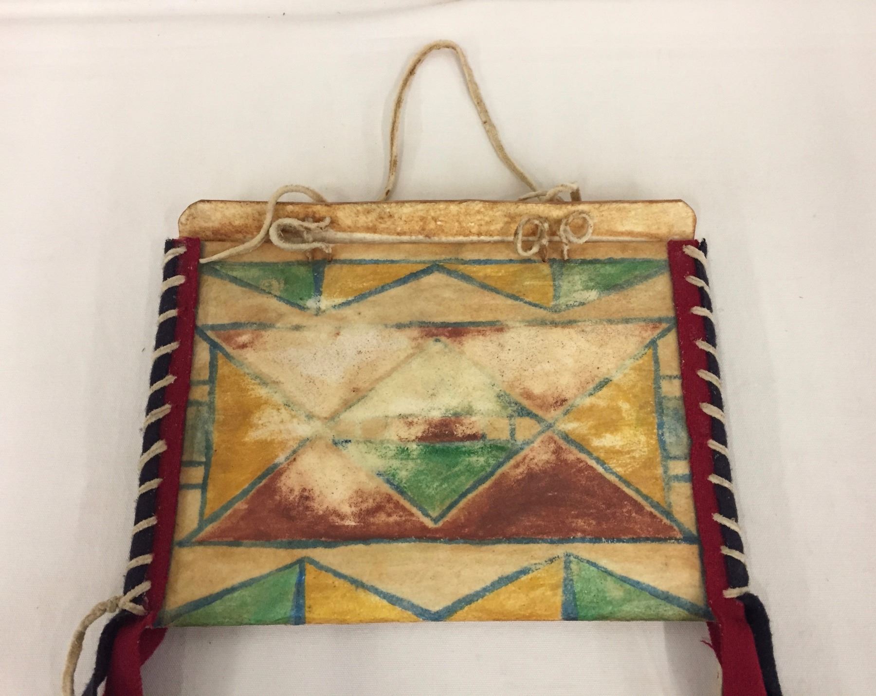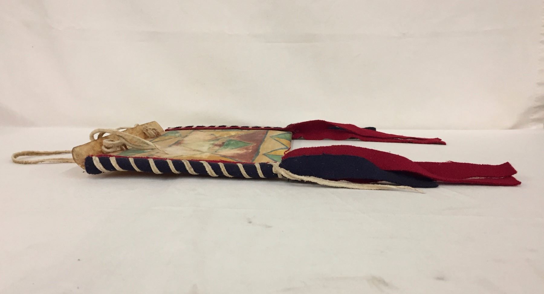 Description: Vintage handmade parfleche container. Maker: Unknown. Approx. Age: Circa 1950s. Size: Measures 12" x 8 1/2". Condition: Pretty good for its age, some wear and fading expected. Please look closely at the pictures - they are an important part of our description. Shipping: There will be a $7 handling / packaging fee for shipping this lot. The actual cost of postage will be added on top of that.