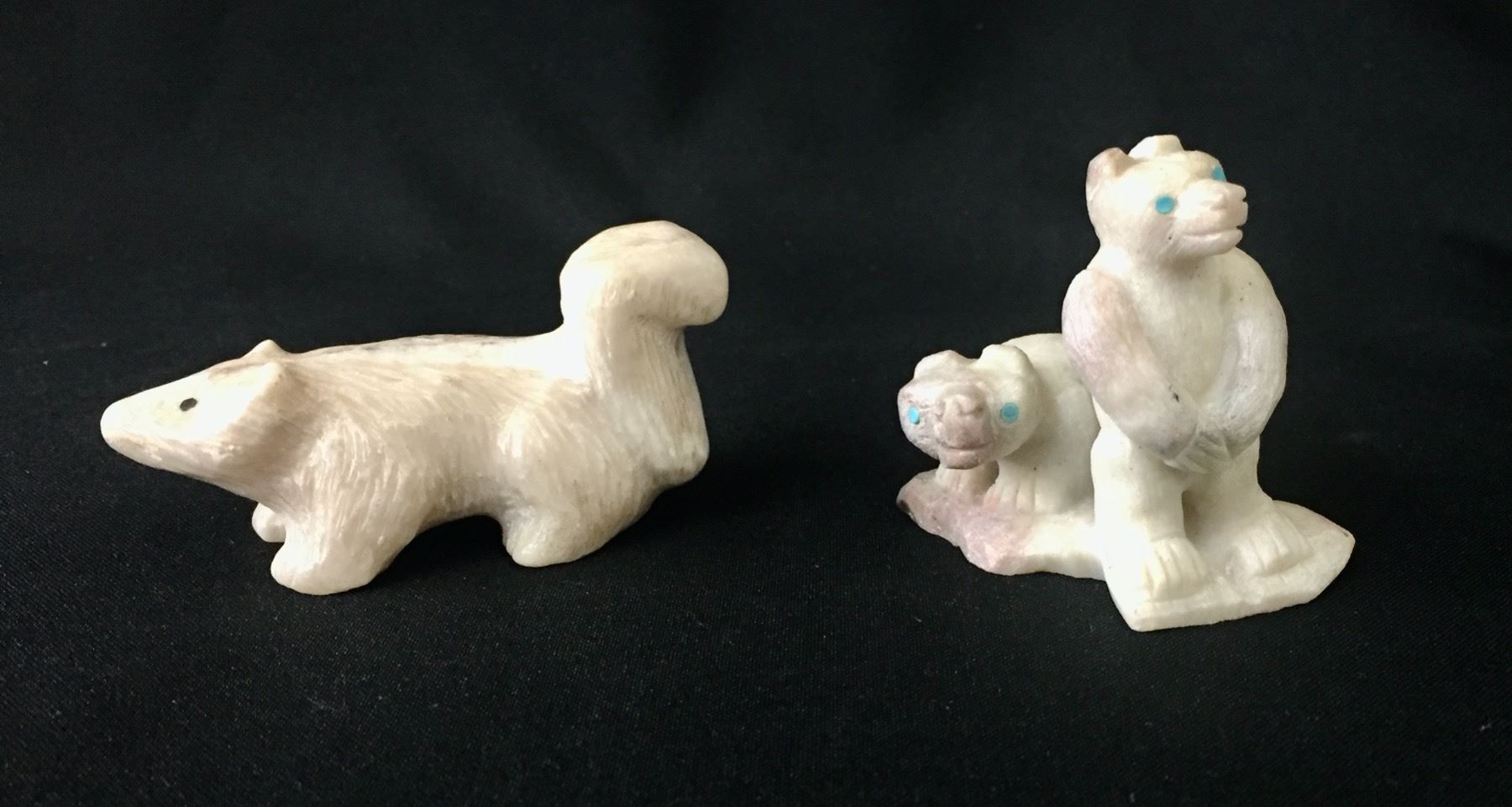 Description: Presented for sale in this lot are two handmade Zuni fetishes. One is the likeness of a squirrel and the other is a pair of bears with turquoise eyes. Maker: One is by Ephrane Chavez, not sure on the other. Approx. Age: Modern. Size:3-1/8”w x 1-1/2” tall and 2-1/4”w x 2-1/4” tall. Condition: Good for their age, normal wear expected. Please look closely at the pictures - they are an important part of our description. Shipping: There will be a $5 handling / packaging fee for shipping this lot. The actual cost of postage will be added on top of that.