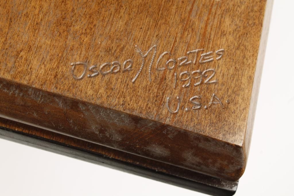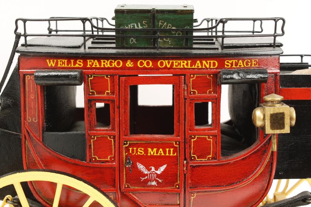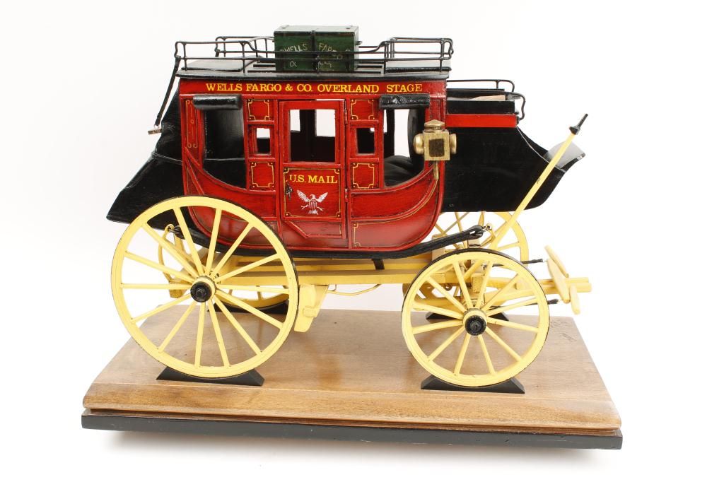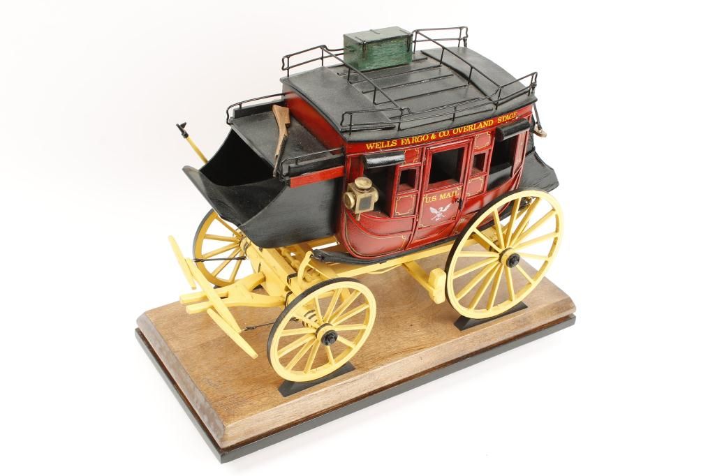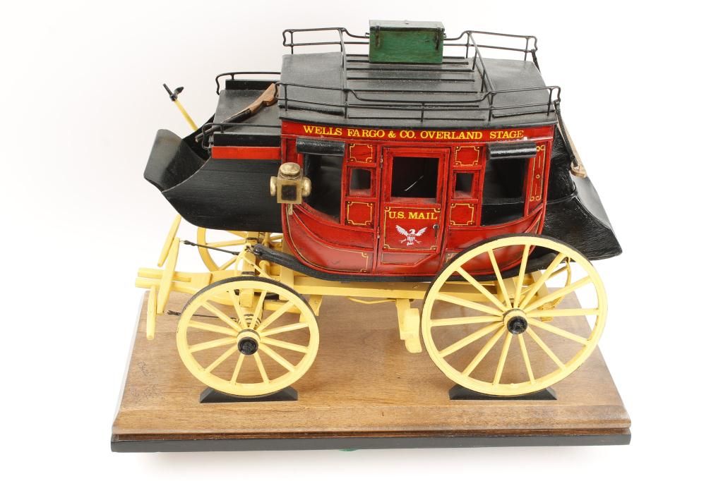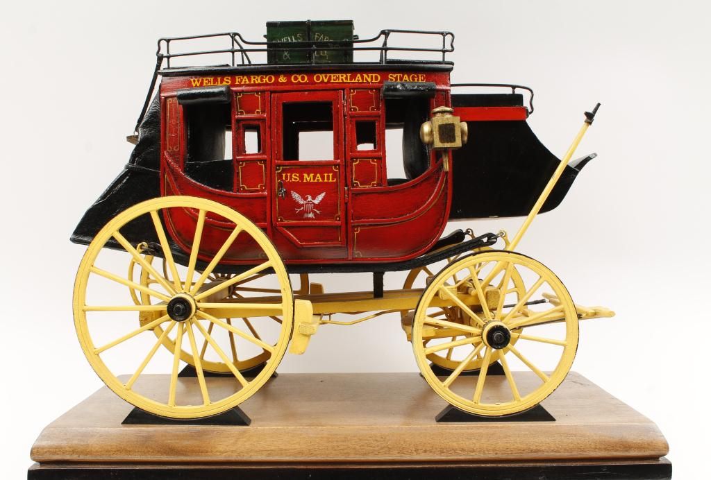 Handmade and carved from wood miniature stagecoach with painted decoration displaying “Wells Fargo and Company Overland Stage”. The artwork is signed by Oscar M. Cortez dated 1992 on-base. The coach measuresapproximately 9” in height by 13 “ in length and is nicely mounted on a 1 ½” in height on wood base. The coach is finely detailed with opening doors and leather straps and full accessories including springs and racks madeof metal. Oscar Cortez worked in the Riverside County area and many articles were written about his fine miniature stagecoaches which he was well-recognized for making before he passed away a few years ago. Est.:$400- $800