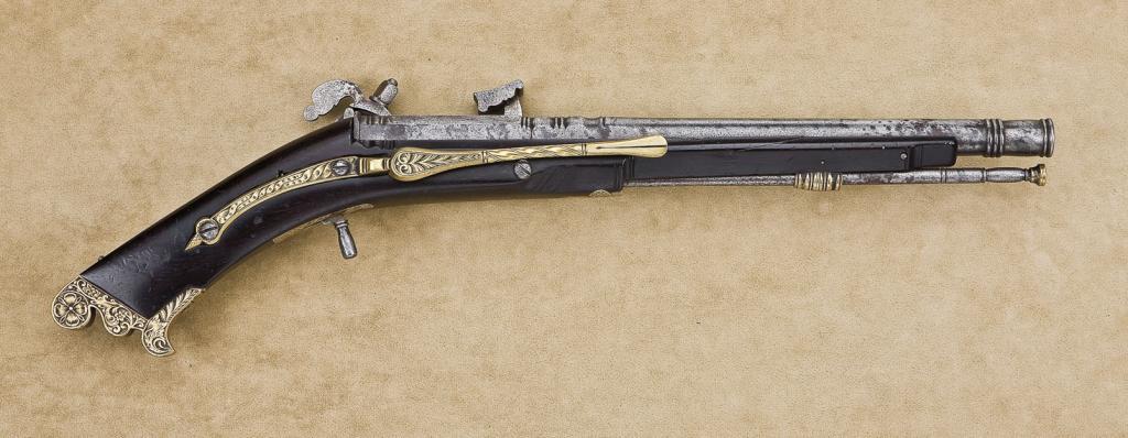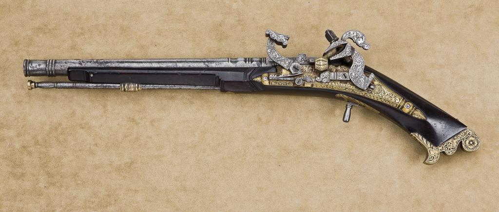 Handmade and high quality Victorian copy of a Scottish Snaphaunce belt pistol, .38 cal., 11” iron cannon barrel, engraved iron mechanism, engraved brass lock plate, butt plate, belt hook, ramrod ferrule and trigger area inset; wood stock. This finely-made work of art shows a grey patina and some scattered spots of erosion and pitting on the iron barrel, the engraving on all lock and accent parts is exquisitely accomplished with a “1620” dated engraving on the bolster end; the action is good, the wood stock is overall very good with scattered nicks and mars from years of storage; brass tipped iron ramrod retained. An outstanding piece that we would date as Victorian era in spite of the above-noted dated part with expertly accomplished engraving on the brass parts and chiseling on the iron. Est.: $2,500-$5,000.