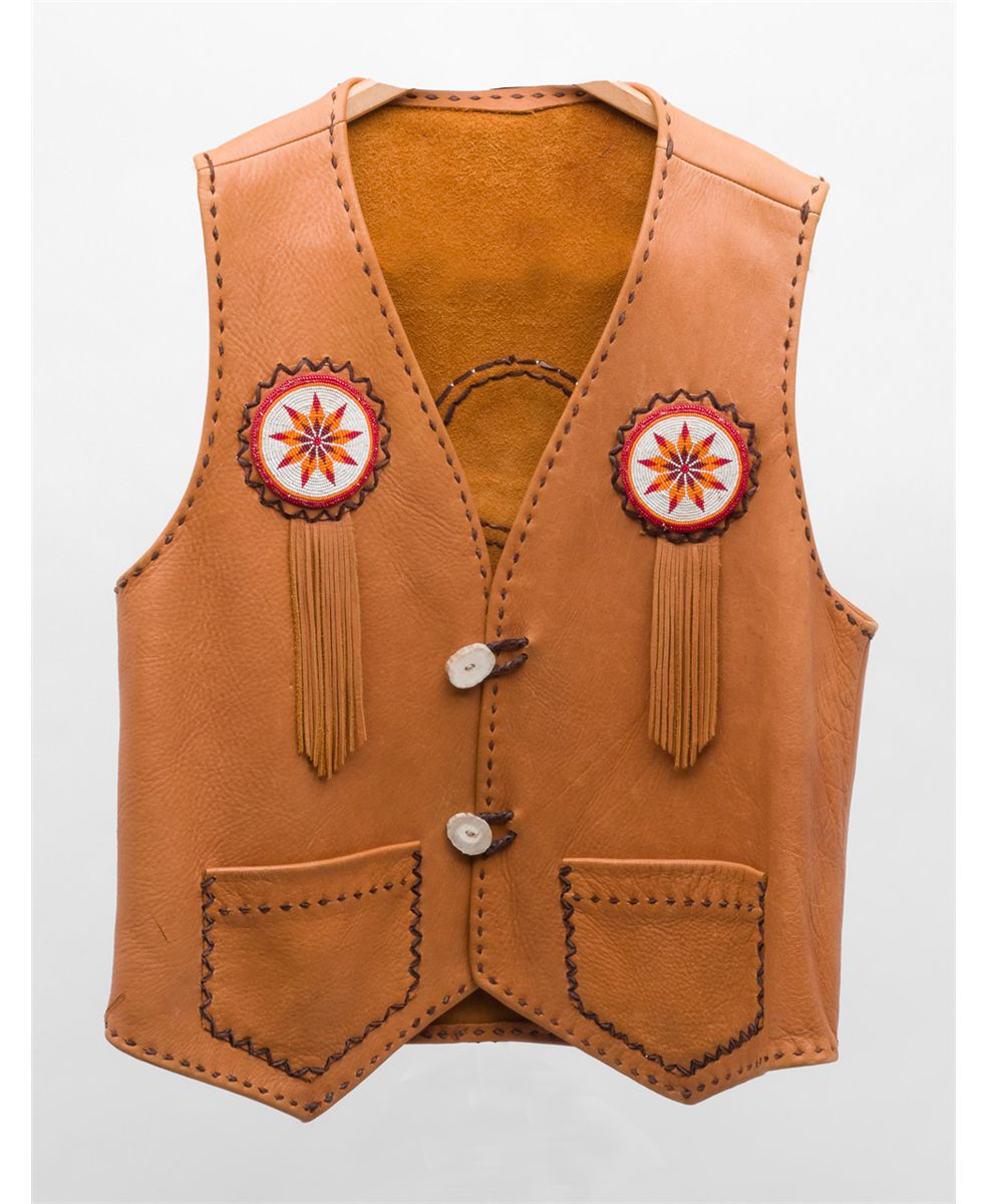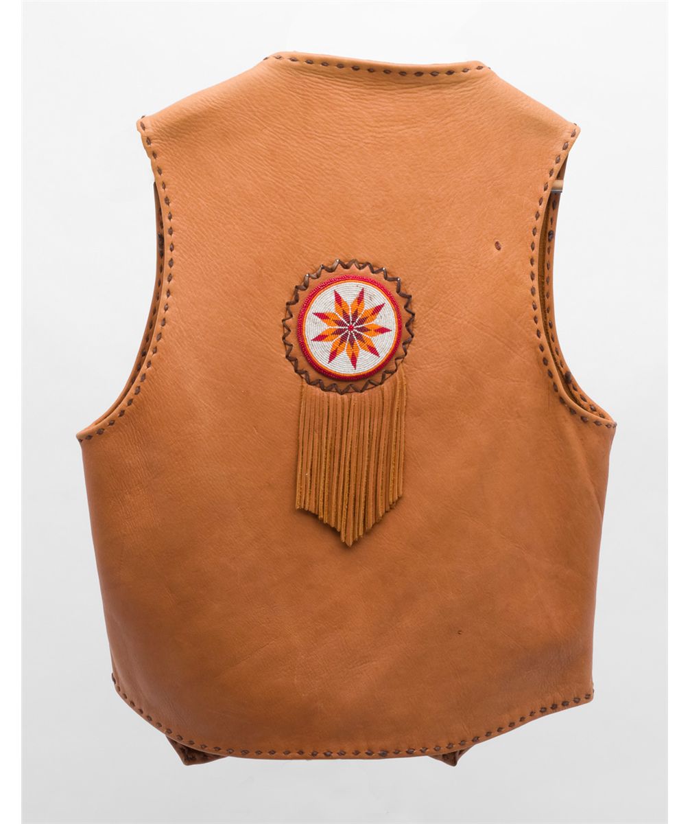 Handmade leather vest; authentic turn-of-the-century Indian beadwork used as ornamentation; made by Leather Patch Custom Products for S.A.S.S. shooter (#66) as authentic costume. Original cost over $650; current retailwould be over $1,100; size 40 Regular; overall fine condition. Est.: $300-$600.