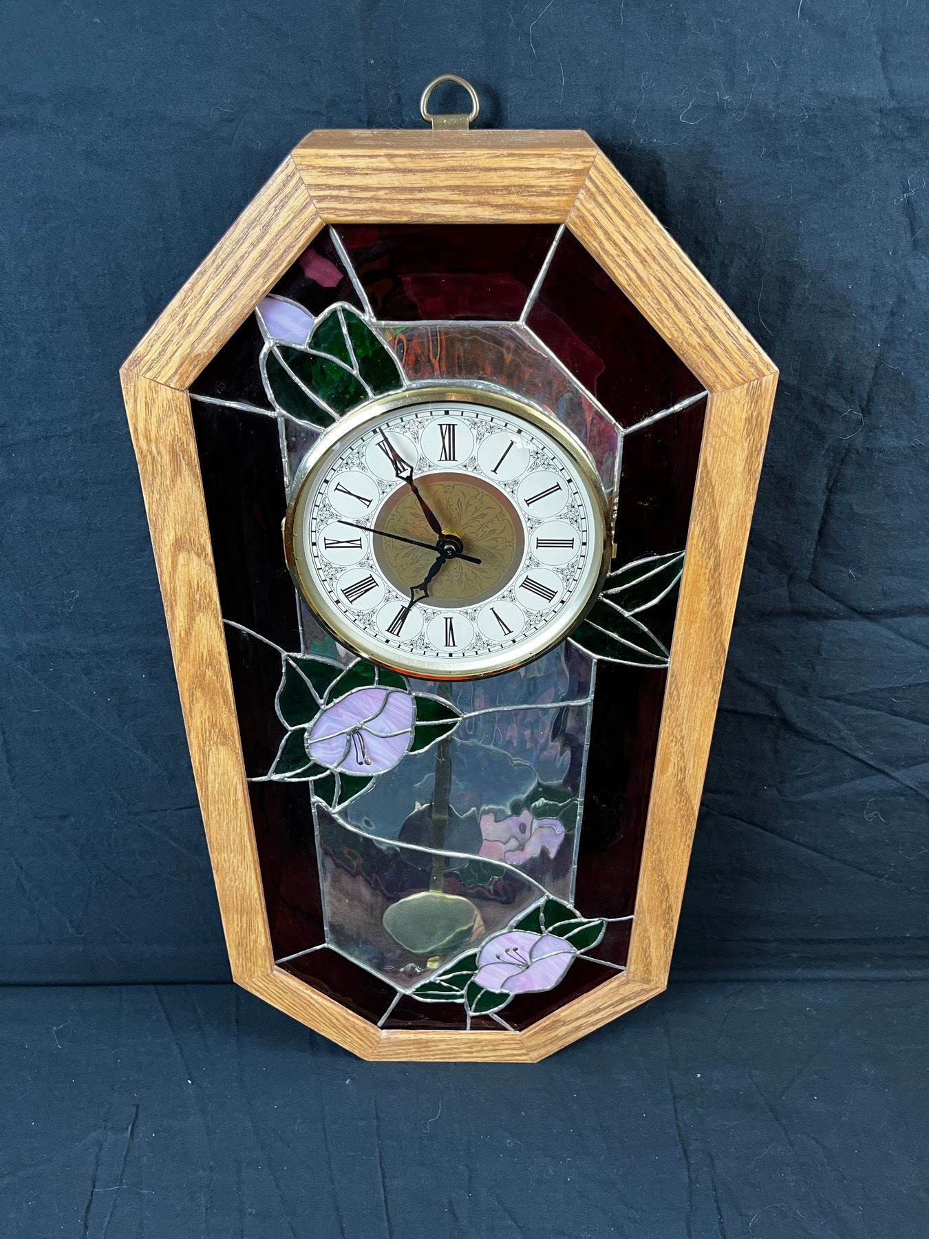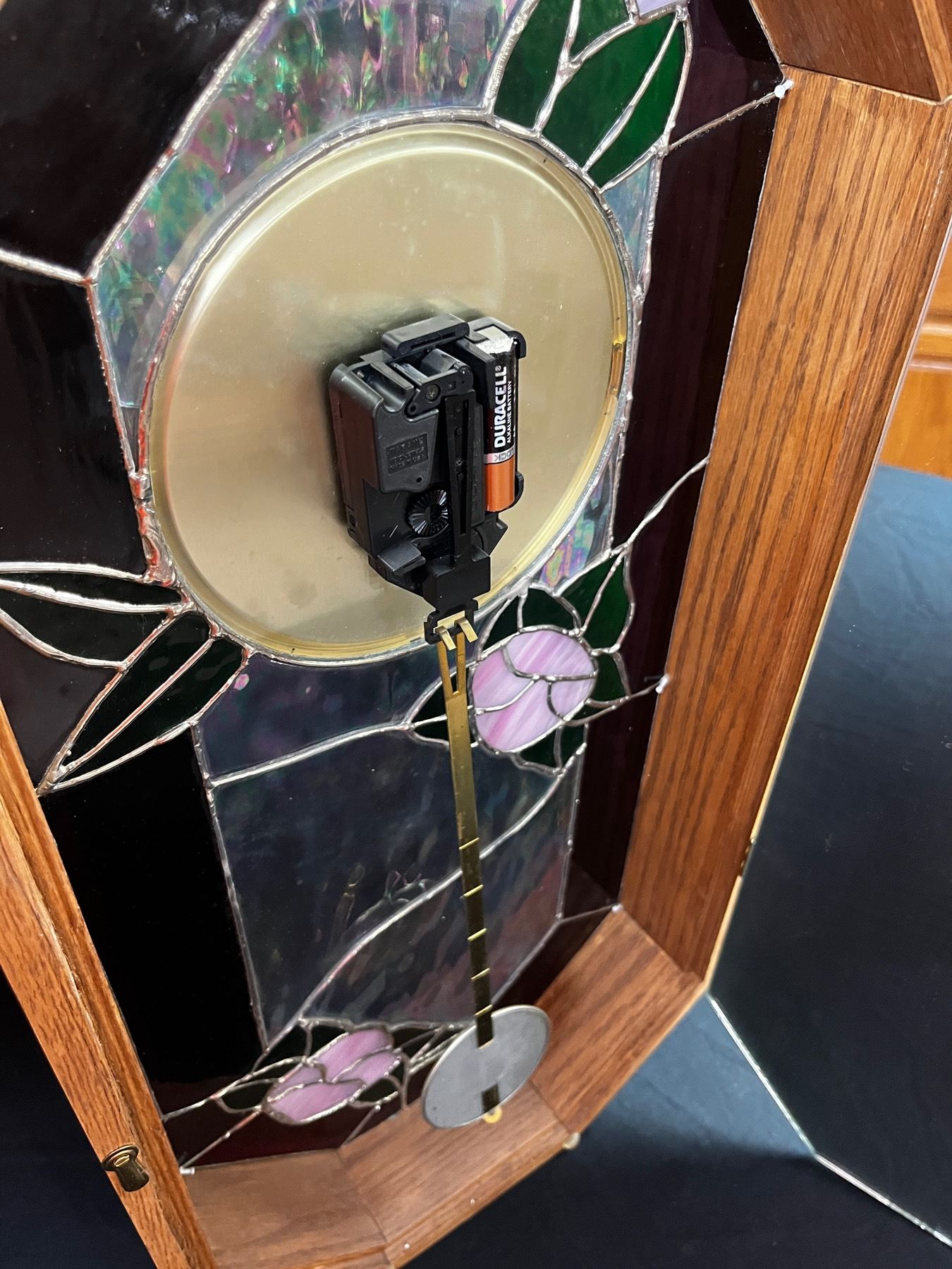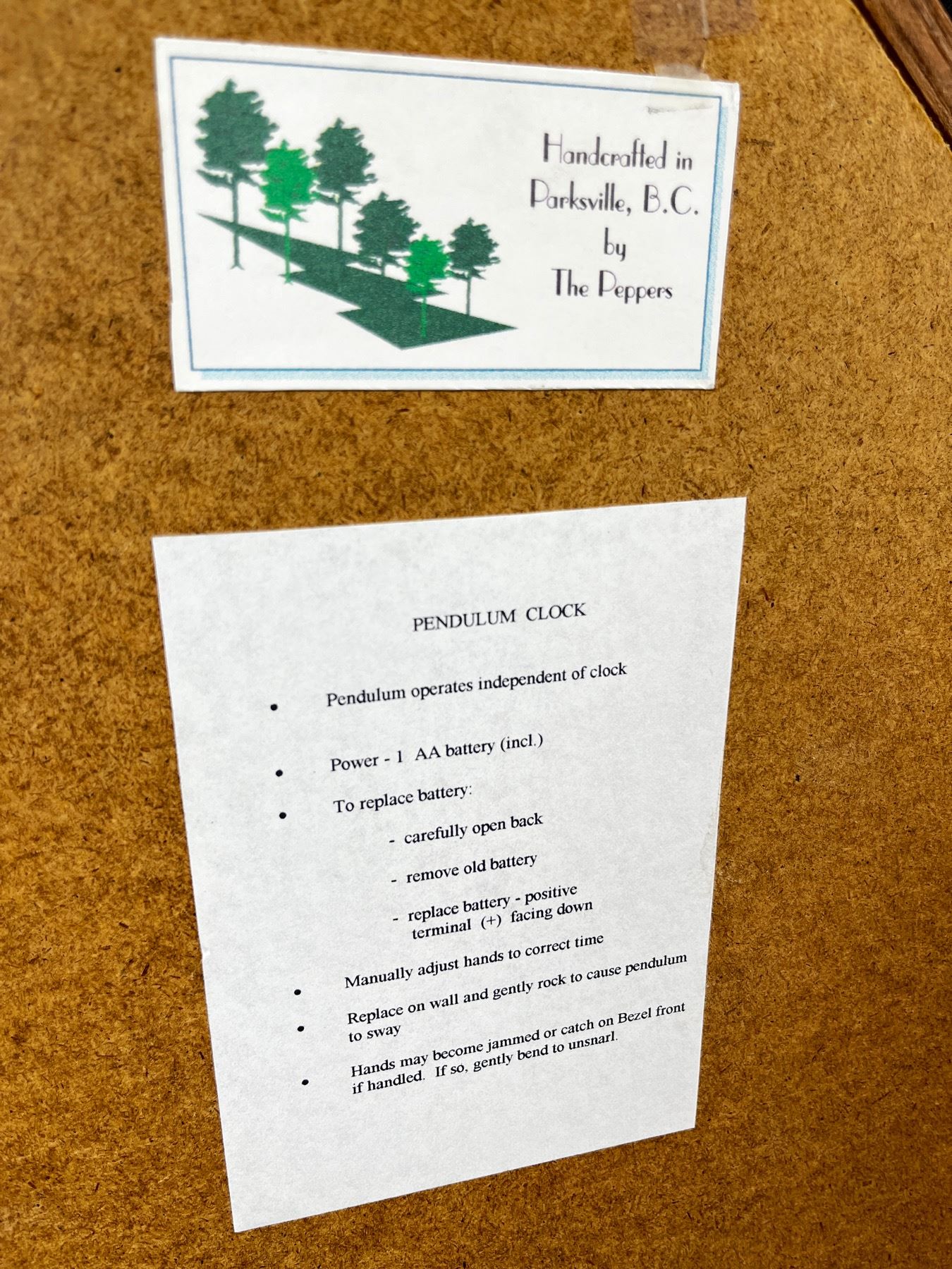 handmade in parksville British columbia, battery opperated pendulum clock. 11x23x3"