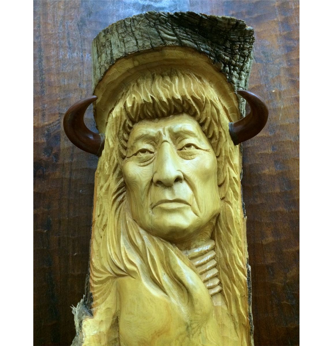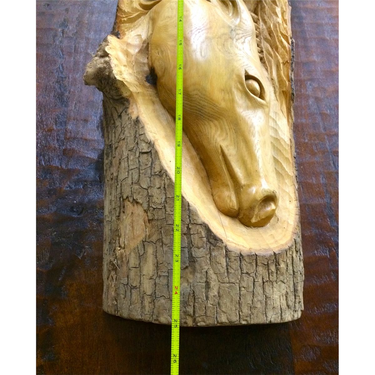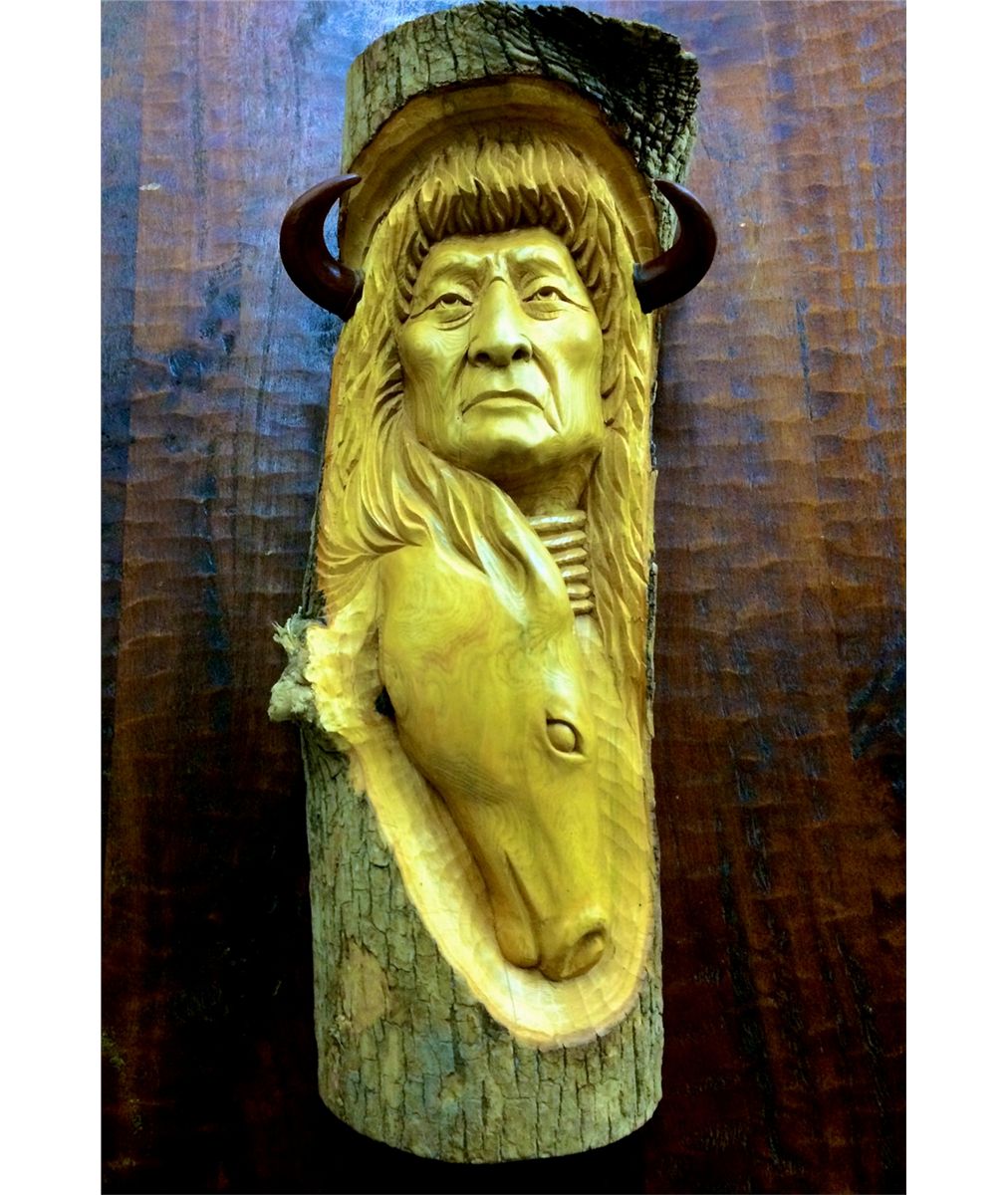 Carved out of a single piece of Oak, this phenomenal wood carving shows a horse head and an Indian Chieftain wearing a buffalo headdress. It is signed on the back, but Paul’s last name was hard to read.