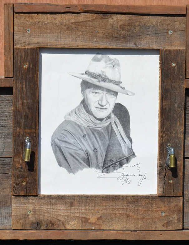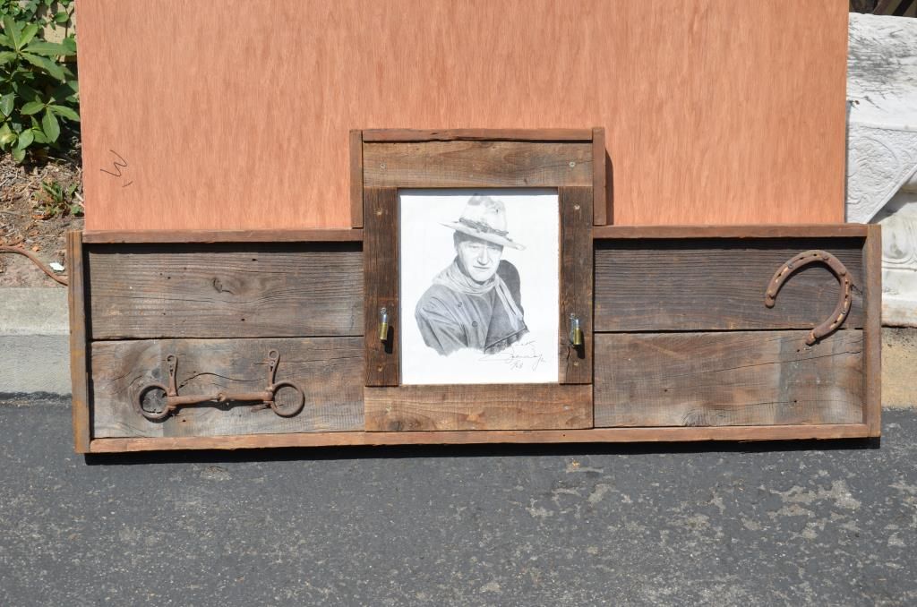 Handmade wooden display rack showing portrait of John Wayne, approx. 49” long x 19” in height and set up to be a wall mount capable of displaying a handgun or longarm. Est.: $100-$150.