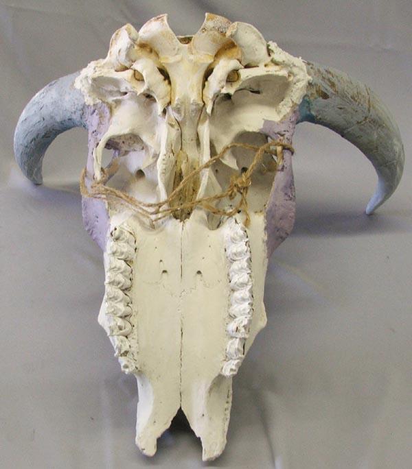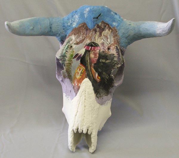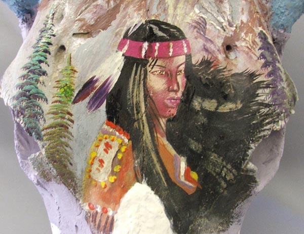 Handpainted Cow Skull, painting depicts Indian with forest background, measures approx. 18'' x 17.5''. SHI $50.