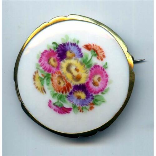 This wonderful brooch is set into goldfilled metal and measures just over 2 inches in diameter. The vivid floral design is handpainted under the glaze and in excellent condition with no markings. There is a hinged pin stem with a C type clasp. I don't see any markings.