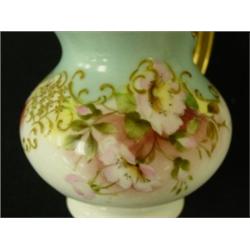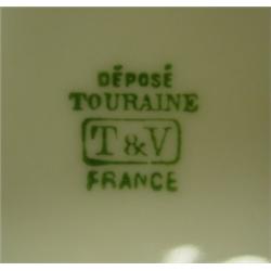 Touraine T&V France tea set. Hand painted floral design with gold accents. Circa Victorian era. Tea pot is 7" x 10". Sugar bowl is 5.5" x 7". Creamer is 4.75" x 5". Condition: Wear to gold on spout and handle. No chips or cracks.