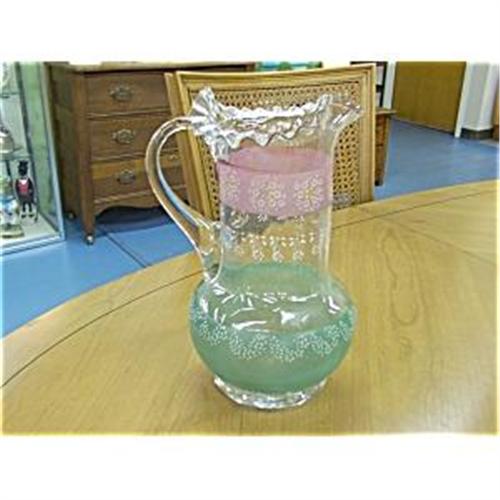 This is a handpainted victorian style pitcher. I was told it was old and it looks older to me but I don't know for sure so you'll have to judge. It's 9.5" tall and has a fluted top The color is green and a rose pink and does show minor wear. It looks to have an applied handle. I do see evidence of a pontil on the bottom so it's probably handblown. No chips or cracks are noted. It's a lovely piece to display.