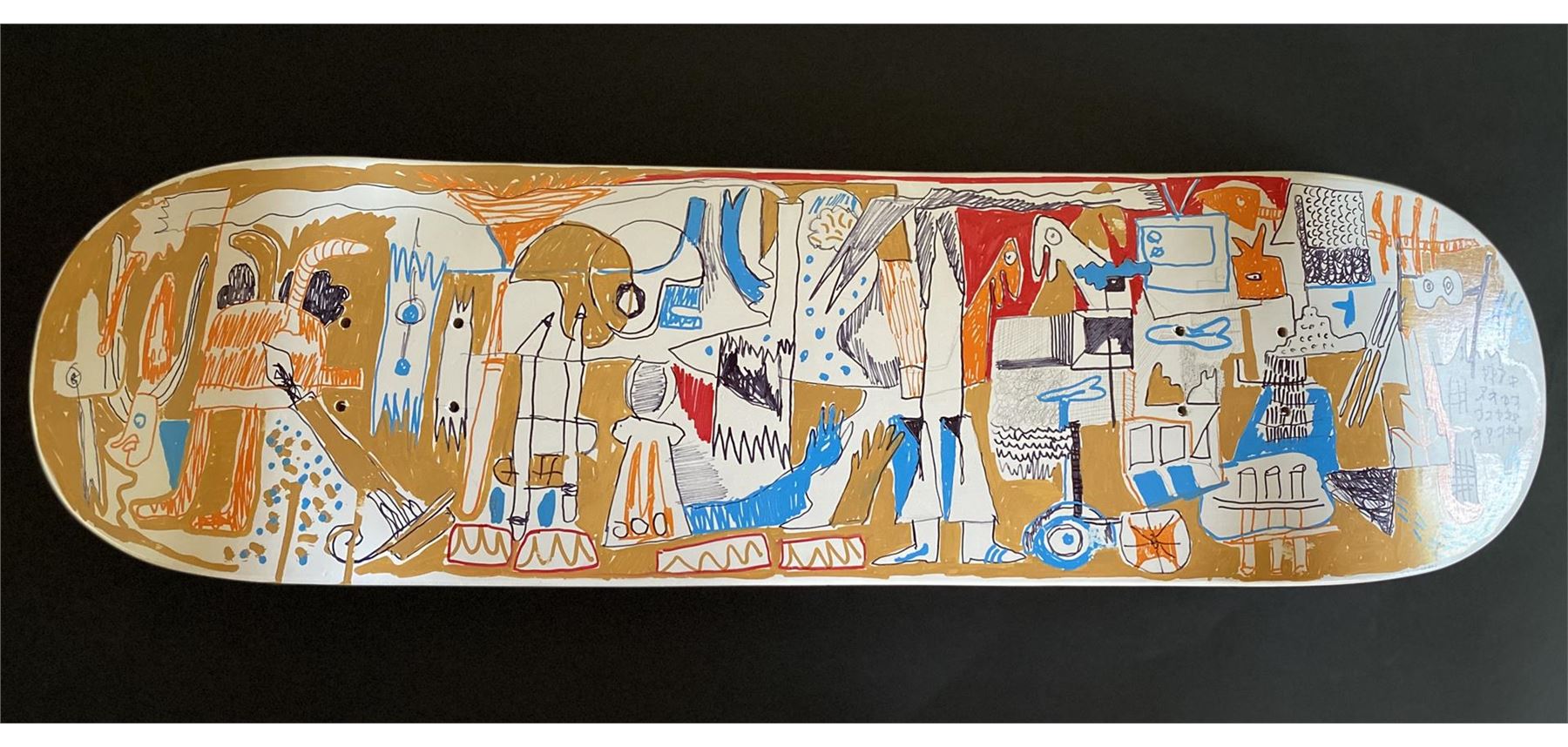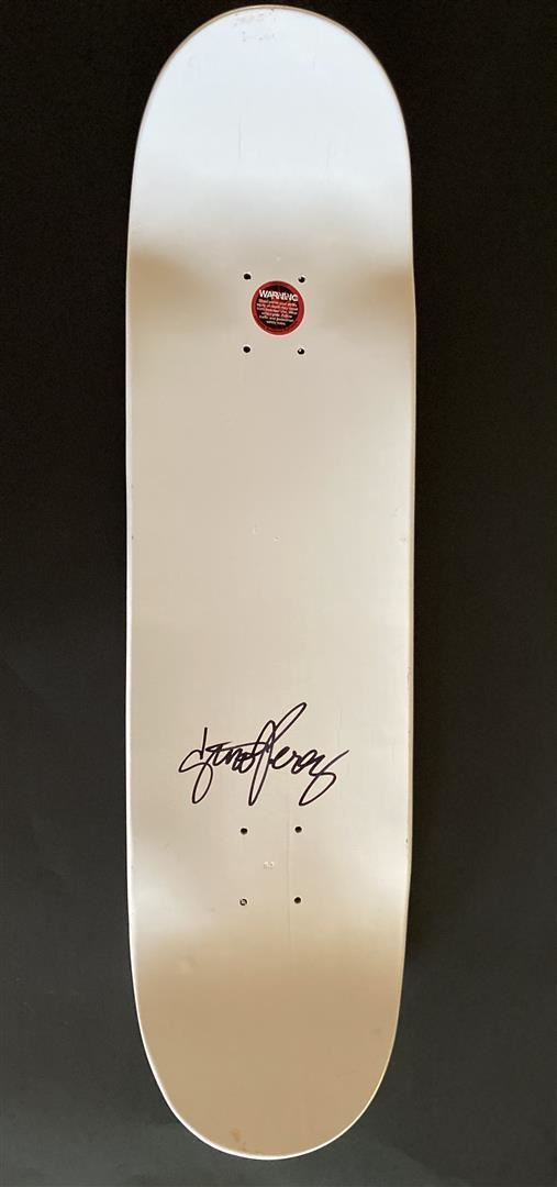 Players by Gino Perez. "Players" is a wood Sugar Skate Co deck, with hand painted original artwork by Gino Perez, and hand signed. Measures approximately 31.5" x 8.5", Year: 2019. Never mounted or displayed.