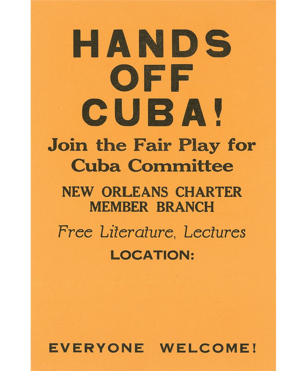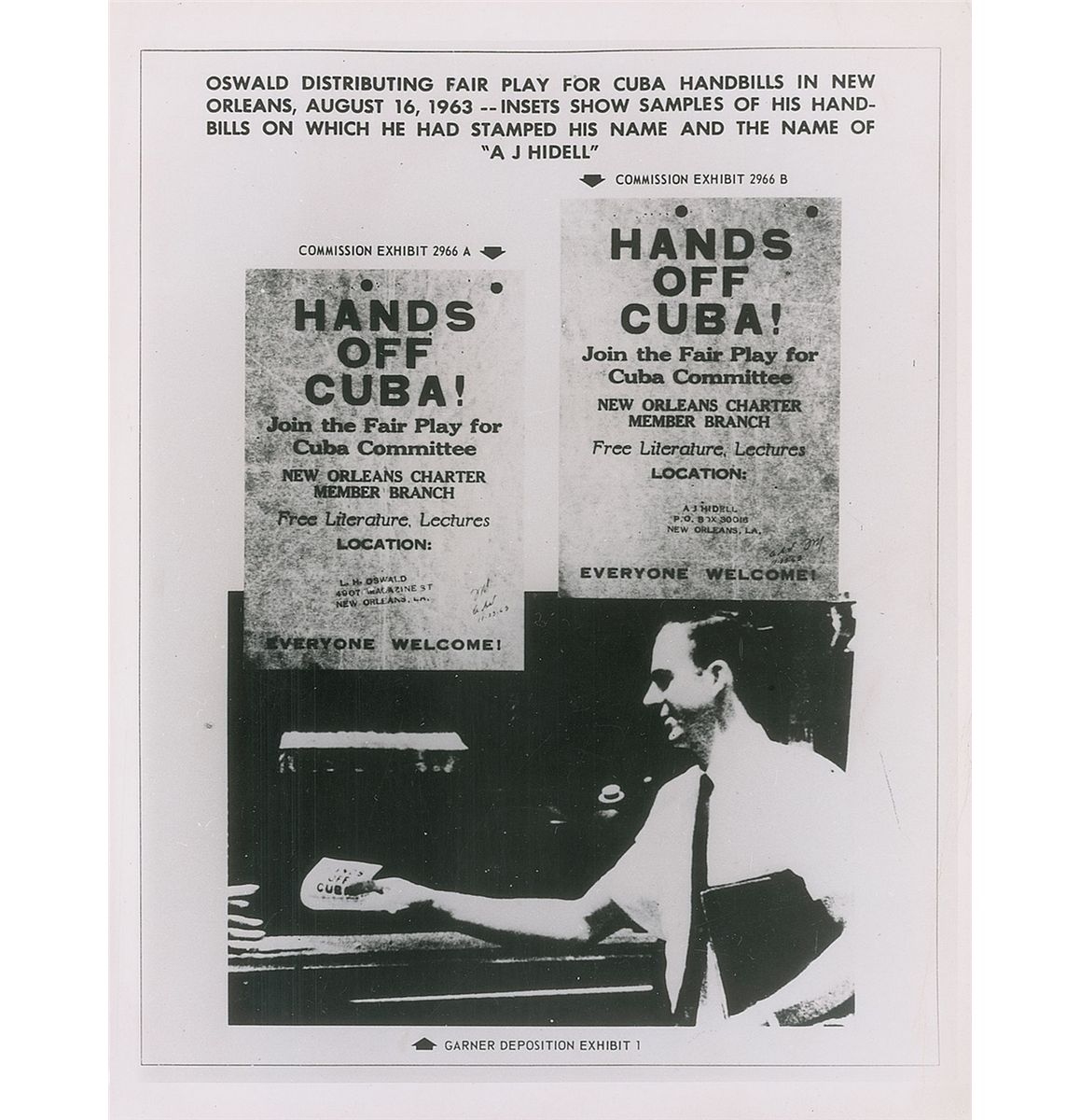 Rare original vintage “Hands Off Cuba!” handbill, one page, 6 x 9, which Oswald designed, had printed, and distributed in New Orleans during the summer of 1963. Goldenrod-colored handbill reads, in full: “Hands Off Cuba! Join the Fair Play for Cuba Committee, New Orleans Charter Member Branch, Free Literature, Lectures, Location: [blank area], Everyone Welcome!” In fine condition, with three horizontal folds. Accompanied by a glossy press photo featuring images of the flyer and of Oswald handing it out, as well as a certificate of authenticity from University Archives. On May 26, 1963, Oswald wrote to the headquarters of the pro-Castro Fair Play for Cuba Committee informing them that he wanted to organize a chapter in New Orleans. He began by ordering 500 application forms, 300 membership cards, and 1000 of these “Hands Off Cuba!” flyers from a local printer. According to the Warren Report, Oswald passed out these handbills on at least three occasions.