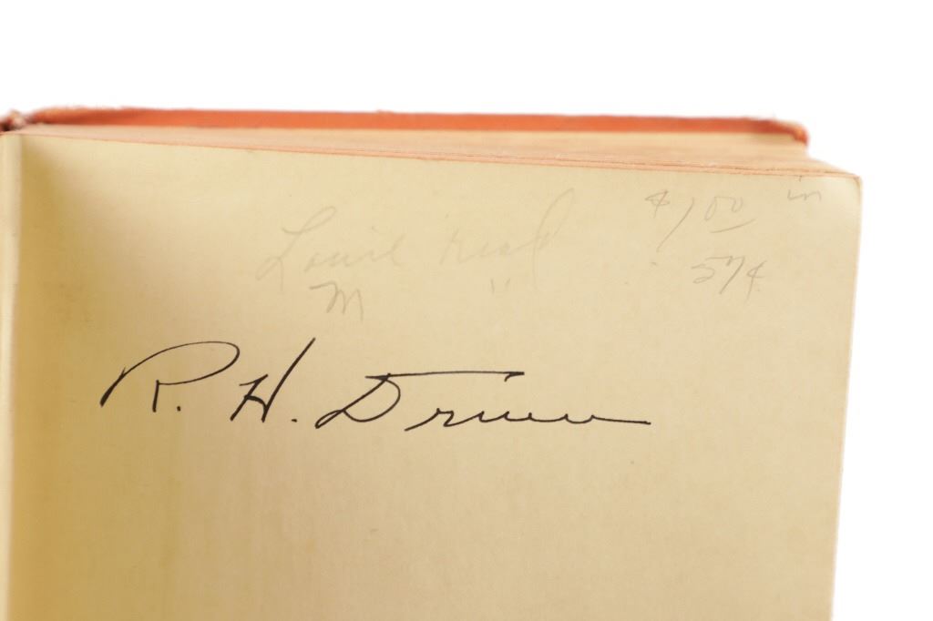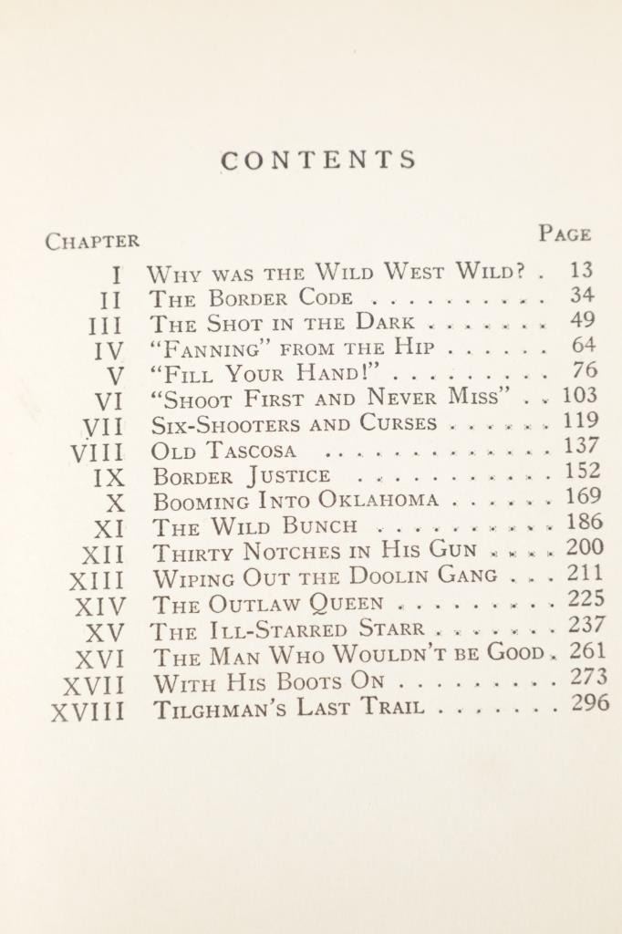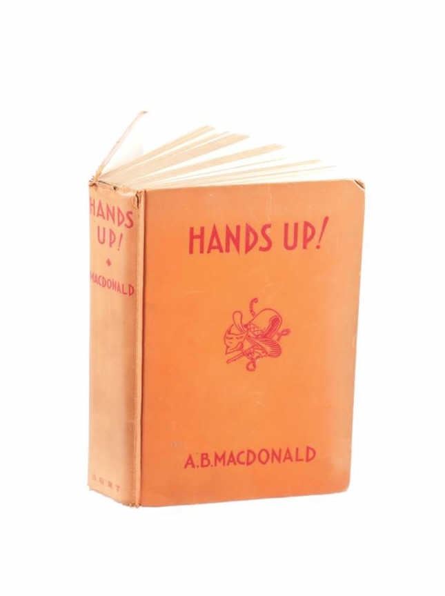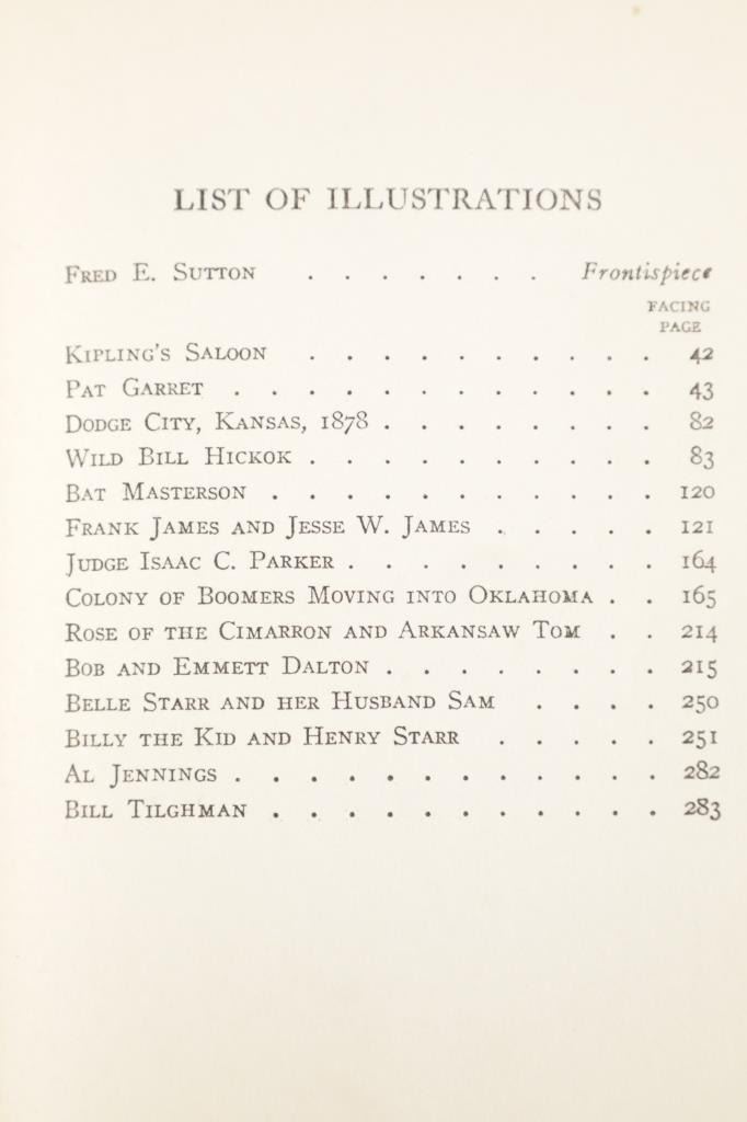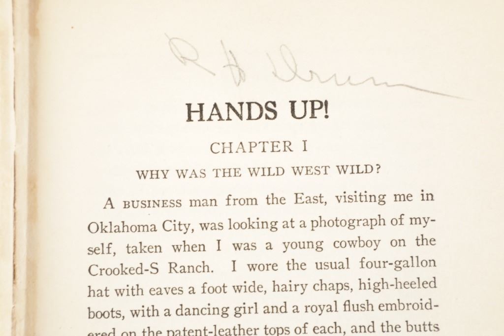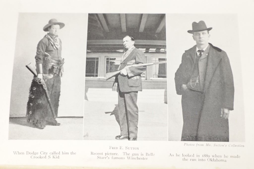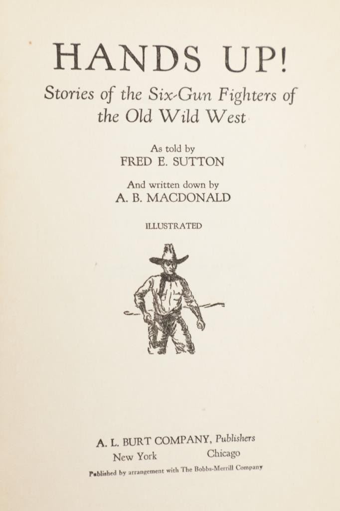 Offered in this lot is a First Edition of "Hands Up! Stories of the Six-Gun Fighters of the Old Wild West" by Fred E. Sutton and A. B. Macdonald, 1927, A. L. Burt Company publishers. Sutton was a gifted story-teller, and he narrated his memoirs in the first person to A. B. Macdonald, a journalist for the Kansas City Star who first published them as a series in the Saturday Evening Post. Fred Sutton (1860-1937), known as the "Crooked S Kid" from his early days as a cowboy on the Crooked S Ranch near Dodge City, and a former U.S. marshal, tells of true stories of the old west characters that he knew personally such as Billy the Kid, Pat Garrett, Wild Bill Hickock, Bat Masterson, Bill Tilghman, Jesse James, the Dalton boys and the Jennings gang. He includes details of how he collected the various guns used by these old west characters for his collection. Later he moved to Oklahoma at a time when it was overrun by bandits who depended on their guns for their livelihood. Sutton became a deputy U.S. marshal under Tilghman. His wild west experiences with outlaws are described. The orange cloth bound illustrated hardcover is in good overall condition, scuffing and fading noted on covers and spine. Intact pages exhibit age tanning. Measures 5.5"W x 8.25"L x 1.5"D, weight is 1lb, 2oz.