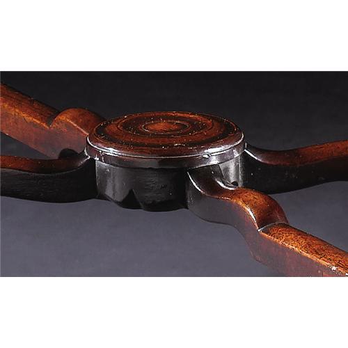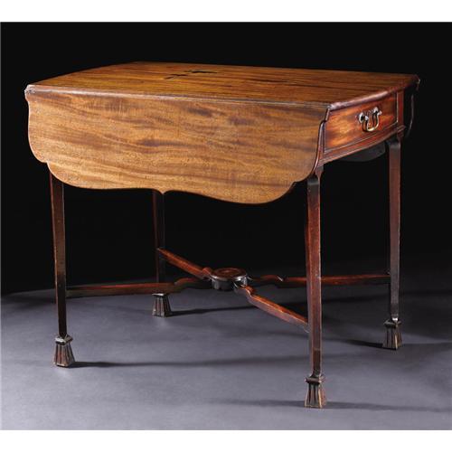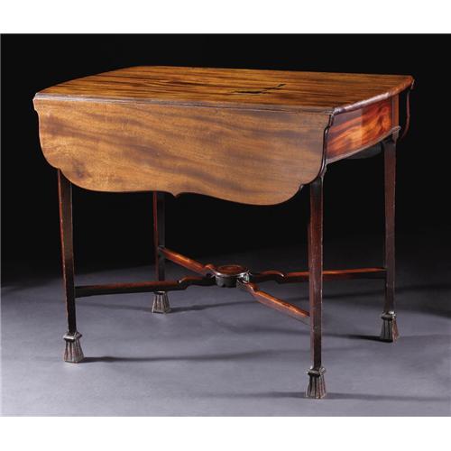 <B>A Handsome Eighteenth Century Mahogany Pembroke Table</B></I><BR><BR>Unknown maker, possibly American<BR>Eighteenth Century<BR>Mahogany<BR>Unmarked<BR>28 inches high x 34.5 inches wide x 39 inches deep<BR>With serpentine leaves above one locking drawer fitted with leaded spice containers on tapering legs with flared feet, with a shaped X-stretcher at base.<BR><BR><BR><BR><b>Shipping:</b> Requires 3rd Party Shipping (<a target="_blank" href="http://www.heritageauctions.com/common/shipping.php">view shipping information</a>)