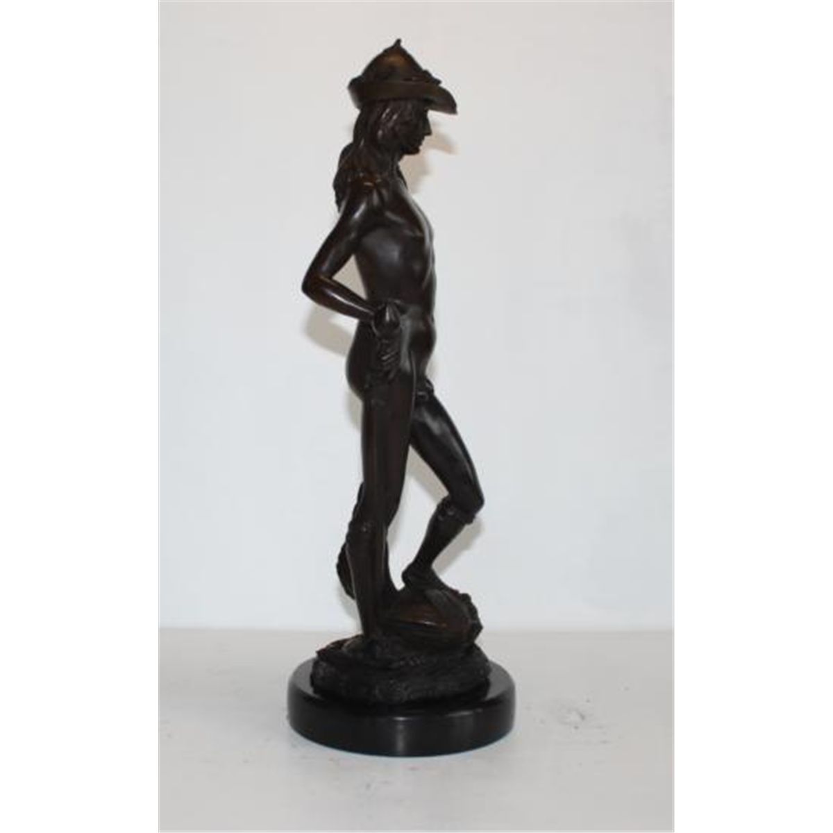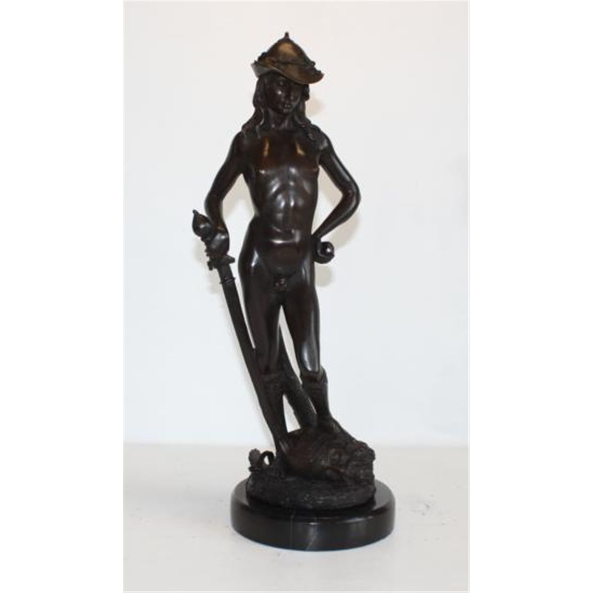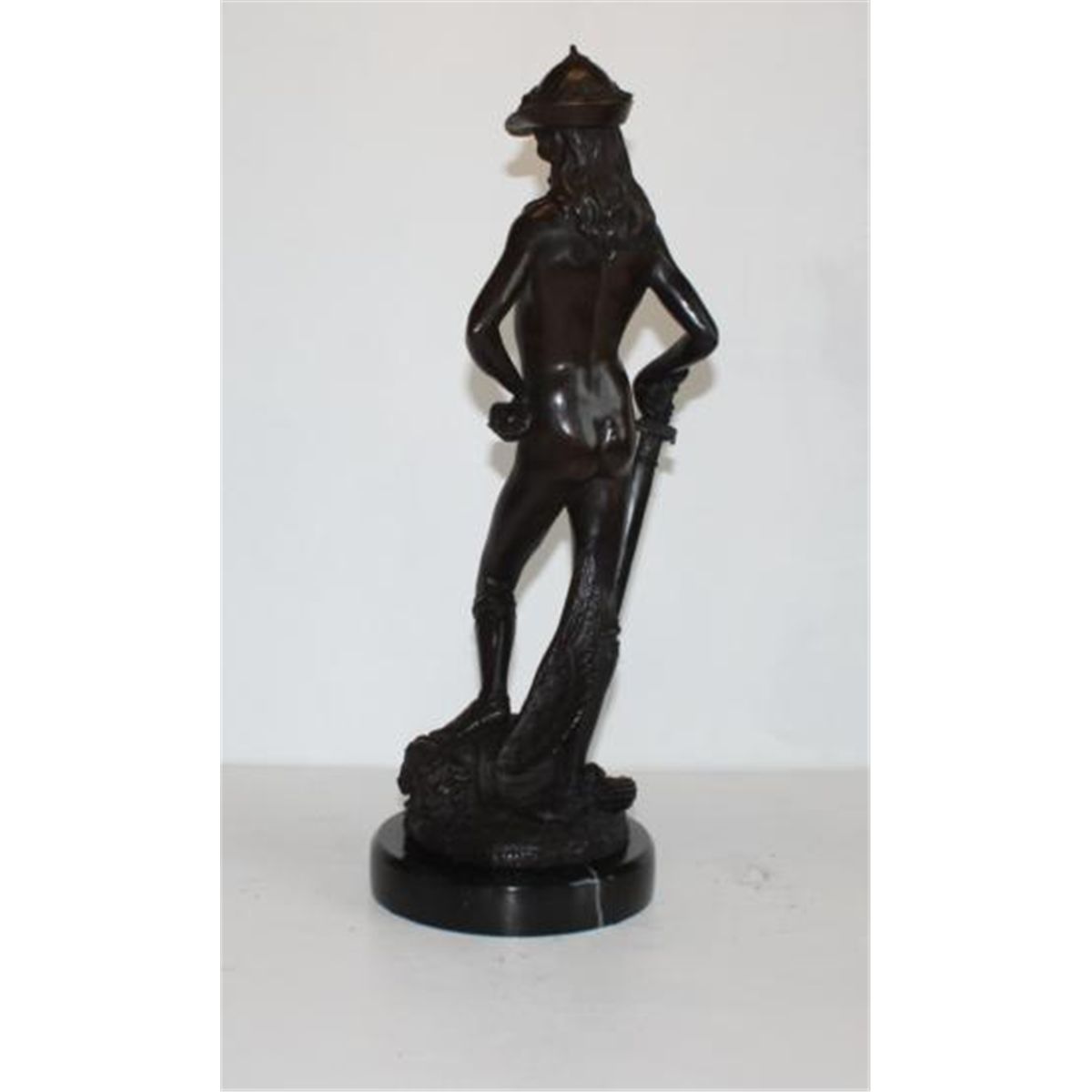 David and Goliath Bronze Sculpture, After Donatello 17 1/2"H x 6 1/2"W x 6 1/2"D 20 lbs. This bronze sculpture was produced using the "Lost Wax" casting method. The"Lost Wax" Cast method is the most precise metal casting technique in existence, ensuring exquisite detail of the original host model which is usually sculpted in clay or wax. This "Lost Wax" casting method is an extremely labor intensive and expensive process, but the end results produce a Heirloom Quality Masterpiece!