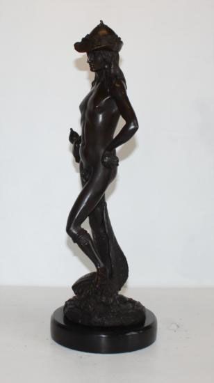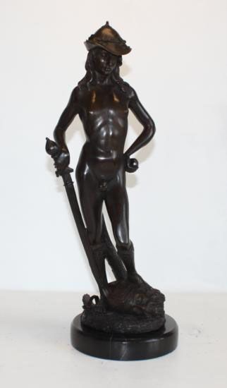 David and Goliath Bronze Sculpture, After Donatello 17 1/2"H x 6 1/2"W x 6 1/2"D 20 lbs. This bronze sculpture was produced using the "Lost Wax" casting method. The"Lost Wax" Cast method is the most precise metal casting technique in existence, ensuring exquisite detail of the original host model which is usually sculpted in clay or wax. This "Lost Wax" casting method is an extremely labor intensive and expensive process, but the end results produce a Heirloom Quality Masterpiece!