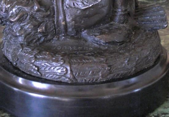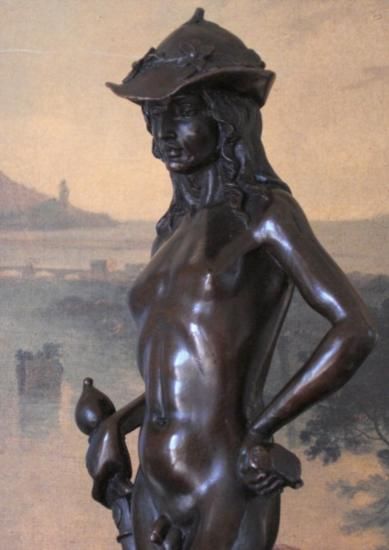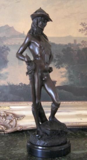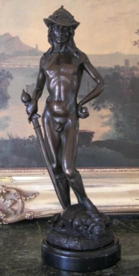 David and Goliath Bronze Sculpture, After Donatello 17 1/2"H x 6 1/2"W x 6 1/2"D 20 lbs. This bronze sculpture was produced using the "Lost Wax" casting method. The"Lost Wax" Cast method is the most precise metal casting technique in existence, ensuring exquisite detail of the original host model which is usually sculpted in clay or wax. This "Lost Wax" casting method is an extremely labor intensive and expensive process, but the end results produce a Heirloom Quality Masterpiece!
